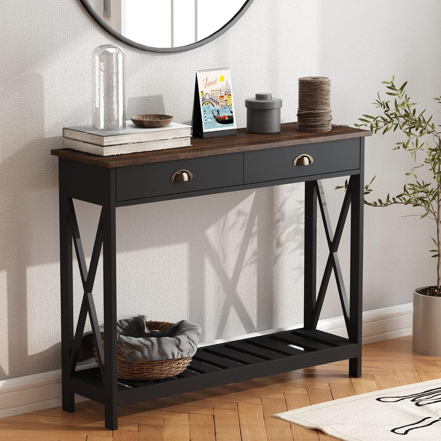 ChooChoo Farmhouse Console Table with Drawer for Entryway, Narrow Long Entry Table with Shelf for Living Room, Rustic Vintage Hallway Sofa Table with Stable X Supports, 40 Black