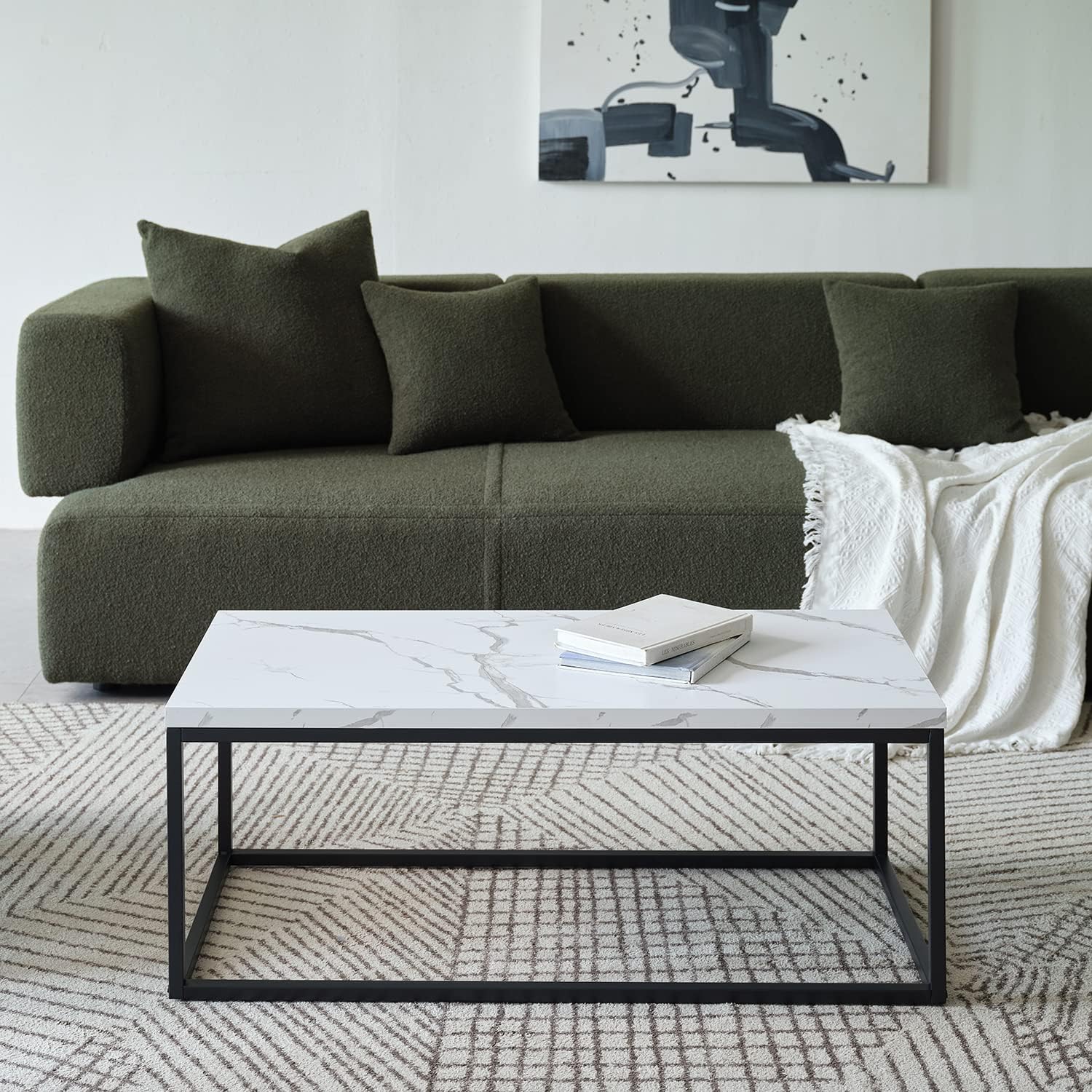 CENSI 40-Inch Marble Accent Coffee Table Ottoman for Living Room, Rectangle, Mid-Century Modern Industrial Style, Extra Thick Top, Wood and Metal (White Marble)