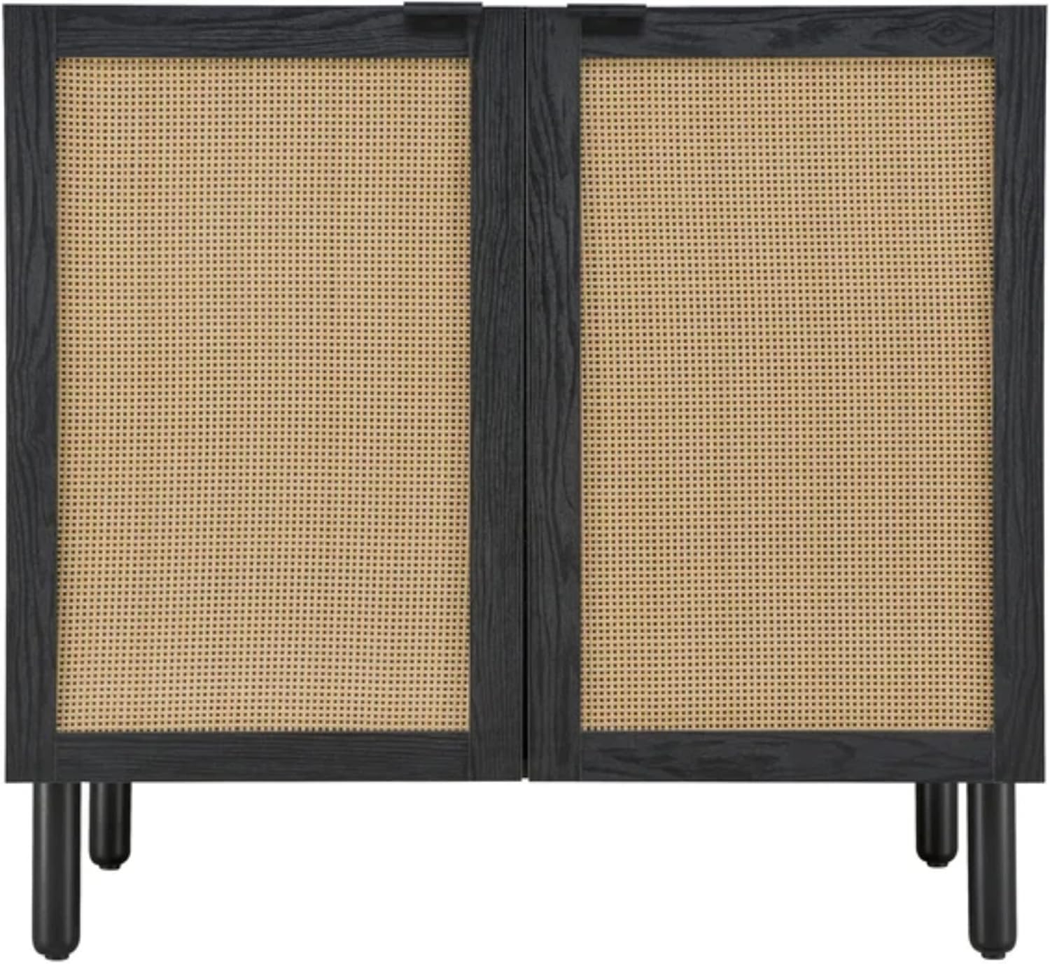 Sango Orre 2-Door Cabinet, Modern Black Storage Cabinet with Synthetic Rattan Door Panels, Adjustable Shelf, Cylindrical Wood Legs, Discreet Finger Pulls, Elegant Furniture for Living or Dining Room