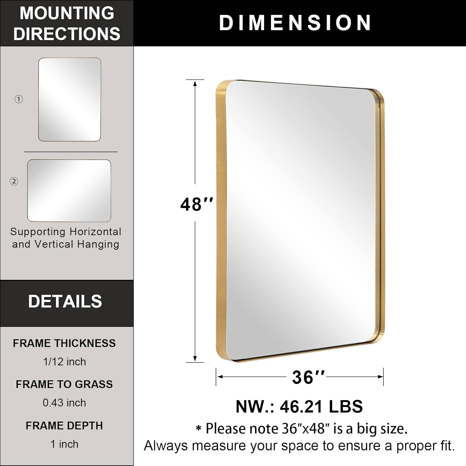 - 36X48” LARGE SIZE: 48X36” size is large enough for you to see entire figure. Features in brushed nickel, matte black, brushed gold finish, also available in 20”x28”, 22”x30”, 24”x36” size. Choose from one of our beautiful brushed gold bathroom mirror to complete your newly constructed or remodeled home.