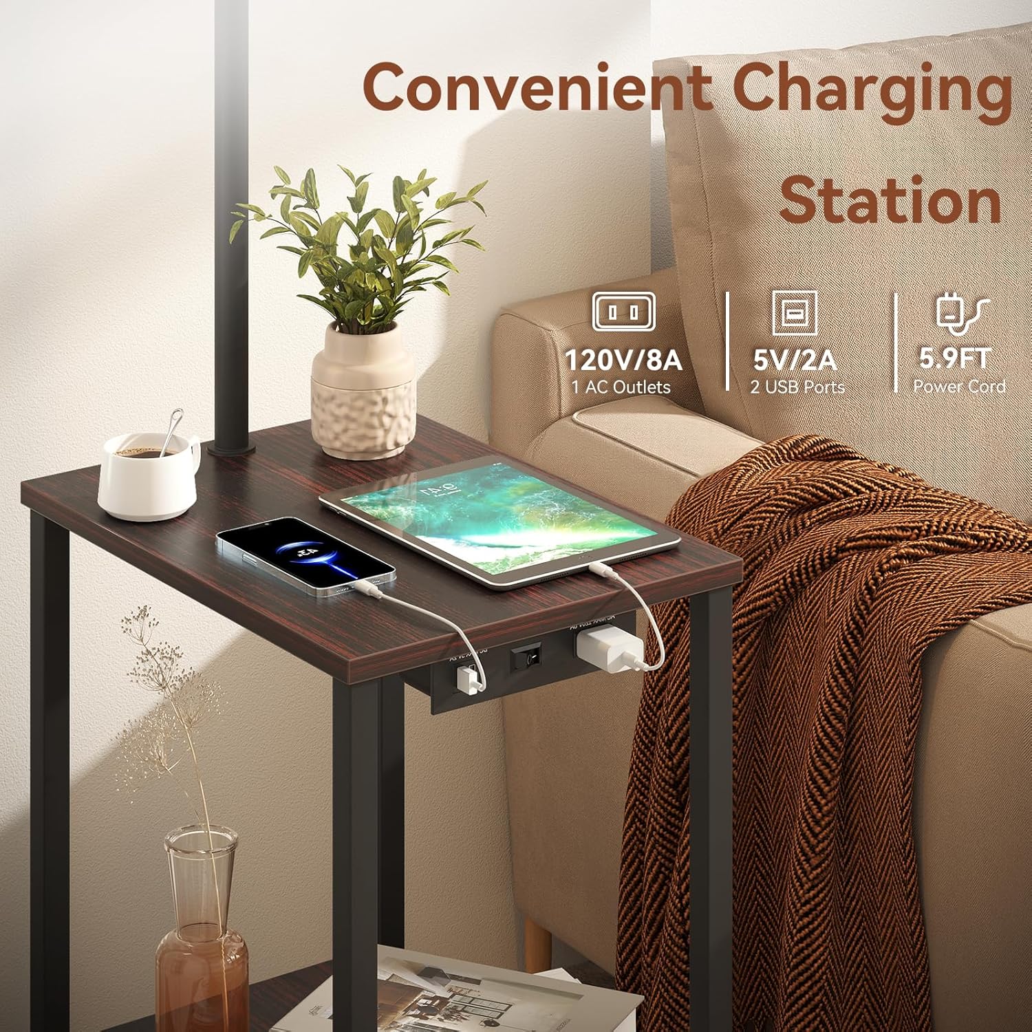 - End Table with Charging Station: This table lamp is built with 2 USB ports (5V/2A), 1 AC charging port (120V/8A), and a 5.9ft power cord. It provides a convenient charging spot for mobile phones, laptops, earphones, watches, and other electronic devices, all of which are easily accessible at your fingertips. As a practical piece of furniture for living rooms and family spaces, it lets you enjoy cozy ambiance while keeping devices powered up.