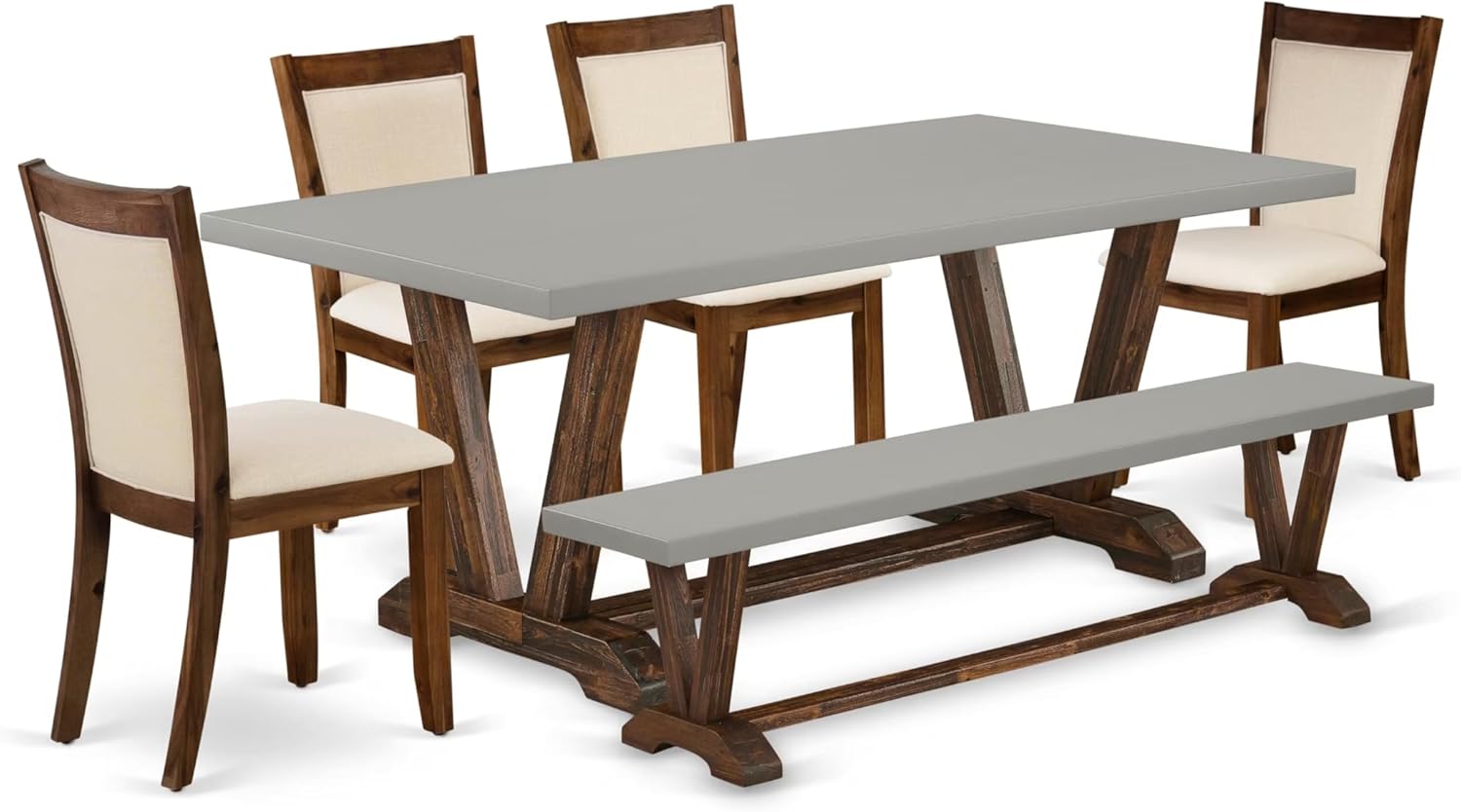 - DINING TABLE SET FINISH: Our dining table and petite bench boast a sophisticated blend of a Cement Top complemented by Distressed Jacobean Finish V-Style Legs. The dining room chairs are thoughtfully designed with Light Beige Linen Fabric seats and Sand Blasting Antique Walnut Wooden Legs. This meticulously curated dining set features a harmonious color palette, meticulously chosen to impart a refined and upscale ambiance to any home.