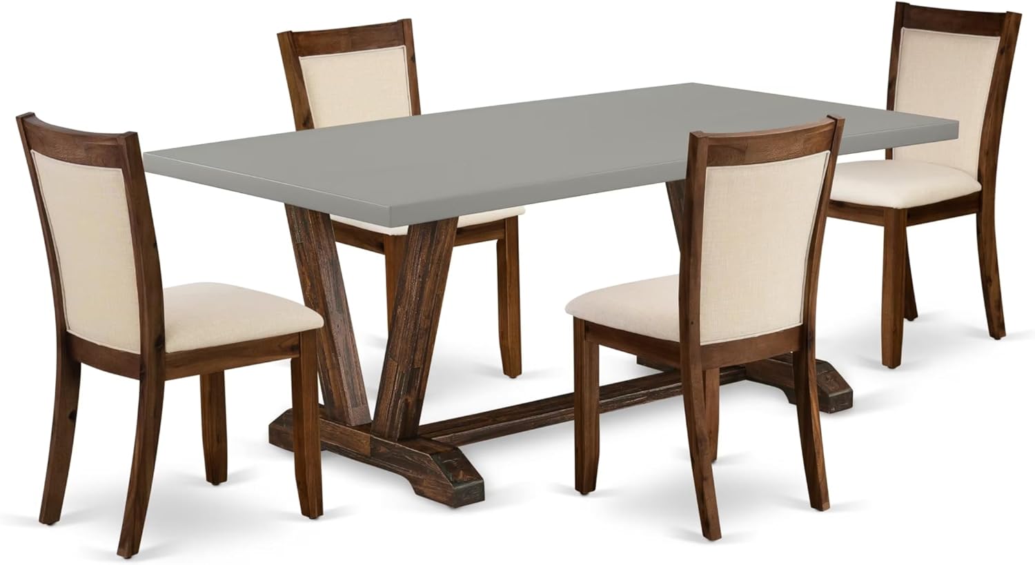 - DINING SET FINISH: This dining room table exhibits a refined composition, featuring a rectangular table top constructed from cement, complemented by V-style legs finished in a distressed Jacobean style. The accompanying chairs are thoughtfully designed with plush padded seats upholstered in a light beige linen fabric, supported by 4 robust wooden legs finished in a sandblasted antique walnut hue.