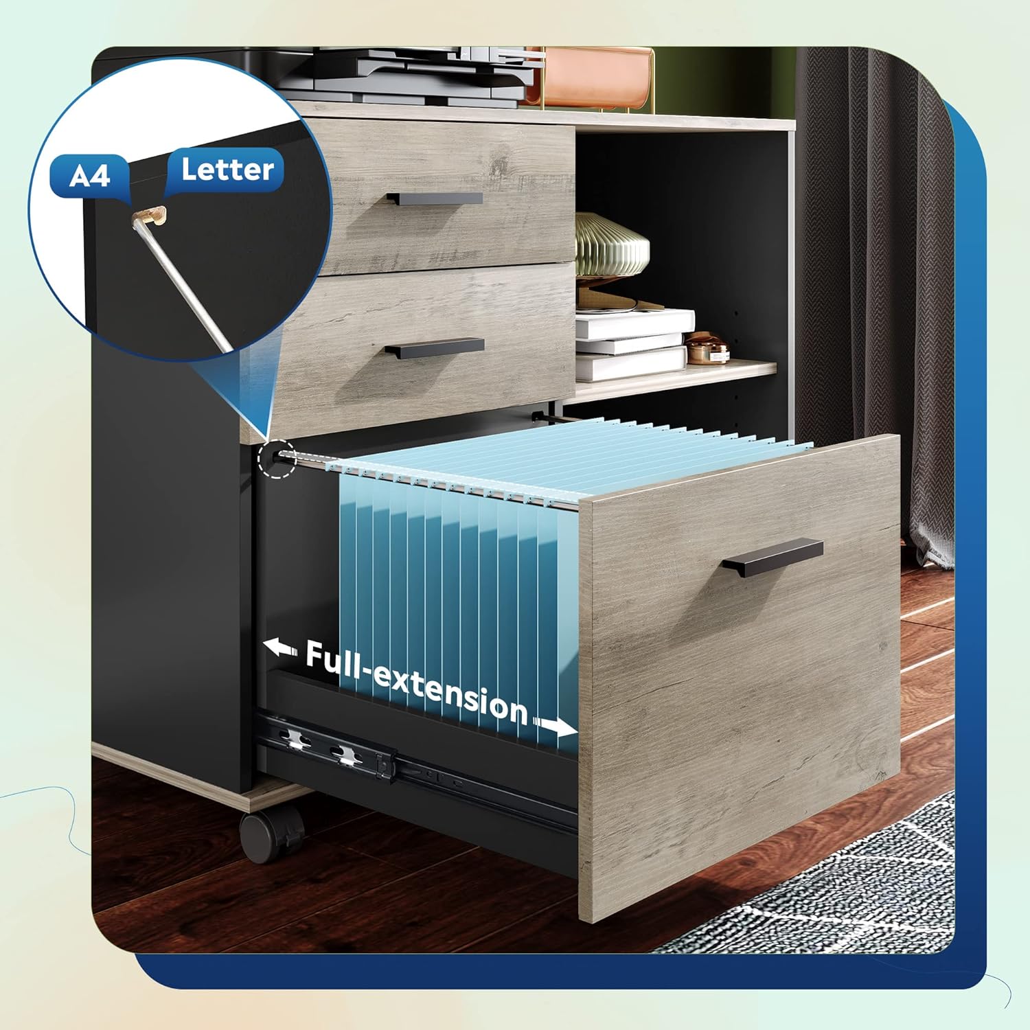 - Generous Storage: This mobile file cabinet offers 3 organizer drawers, with 2 top drawers for office supplies and a bottom drawer with adjustable rails for A4/Letter files. The open shelf and spacious top surface offer additional space for a printer or other devices, keeping your space organized. Smooth full-extension slides ensure quiet and easy access to your files.