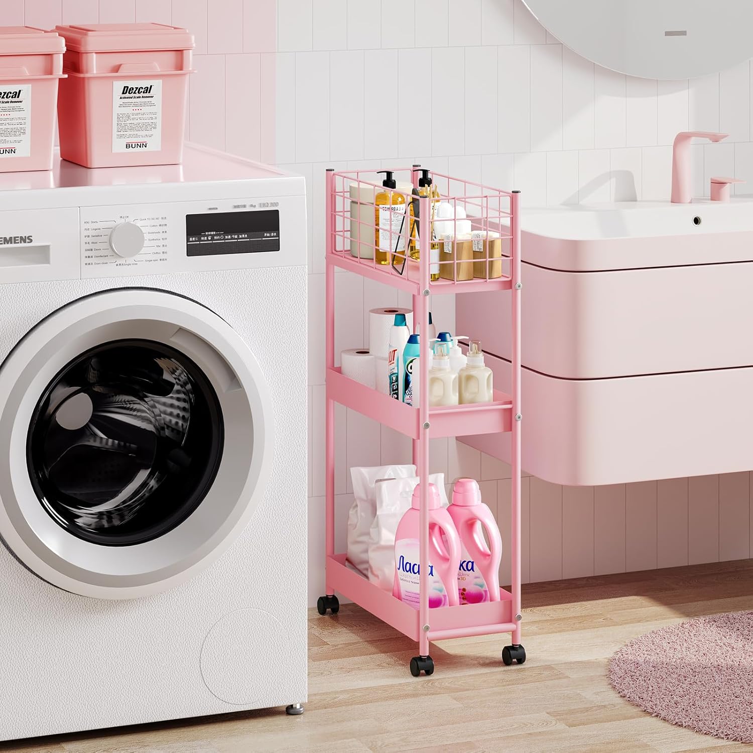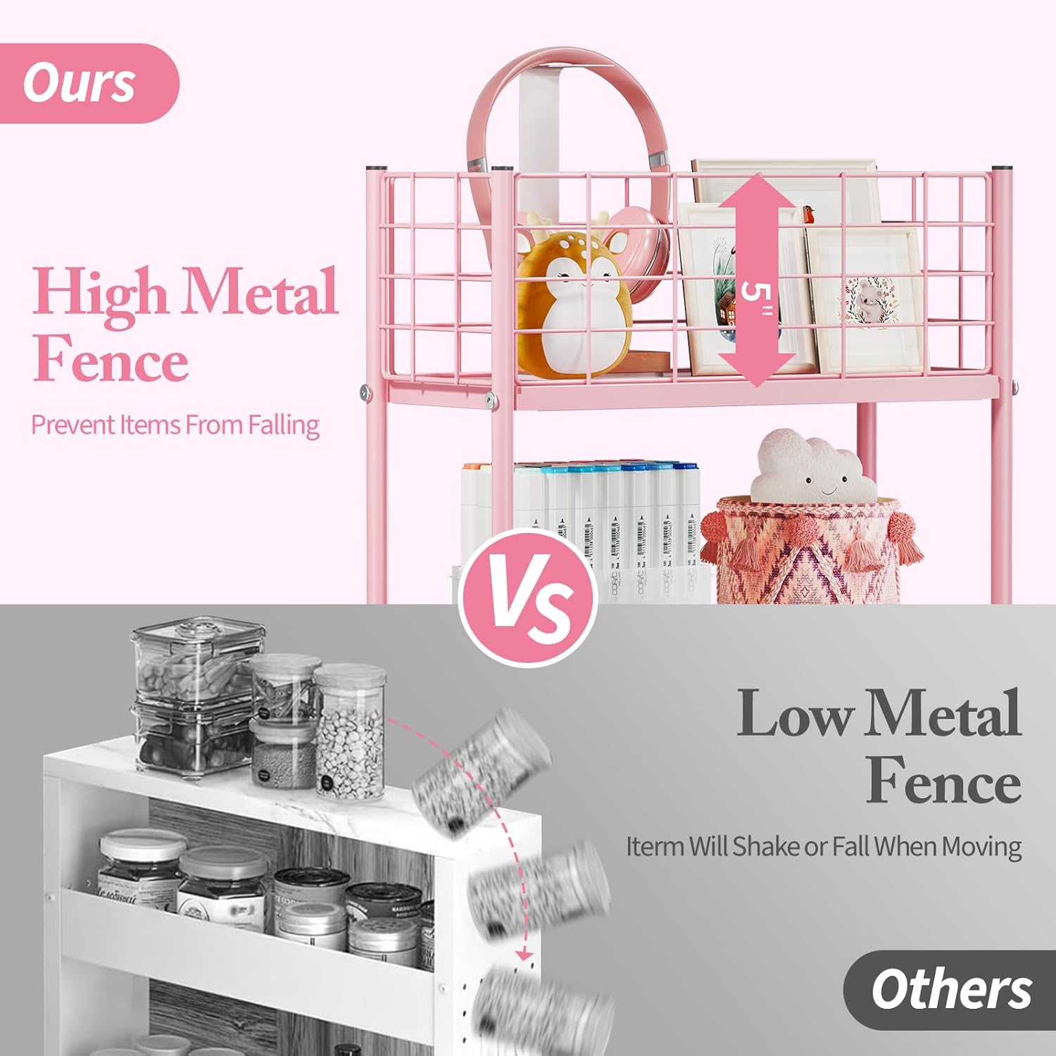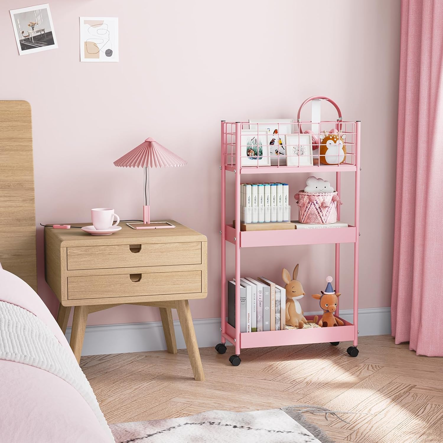 KINGRACK 3-Tier Rolling Utility Cart with Wheels, Metal Slim Storage Cart, Bathroom Multifunctional Storage Organizer, Mobile Shelving Unit for Kitchen, Office, Laundry Room, Narrow Place, Pink