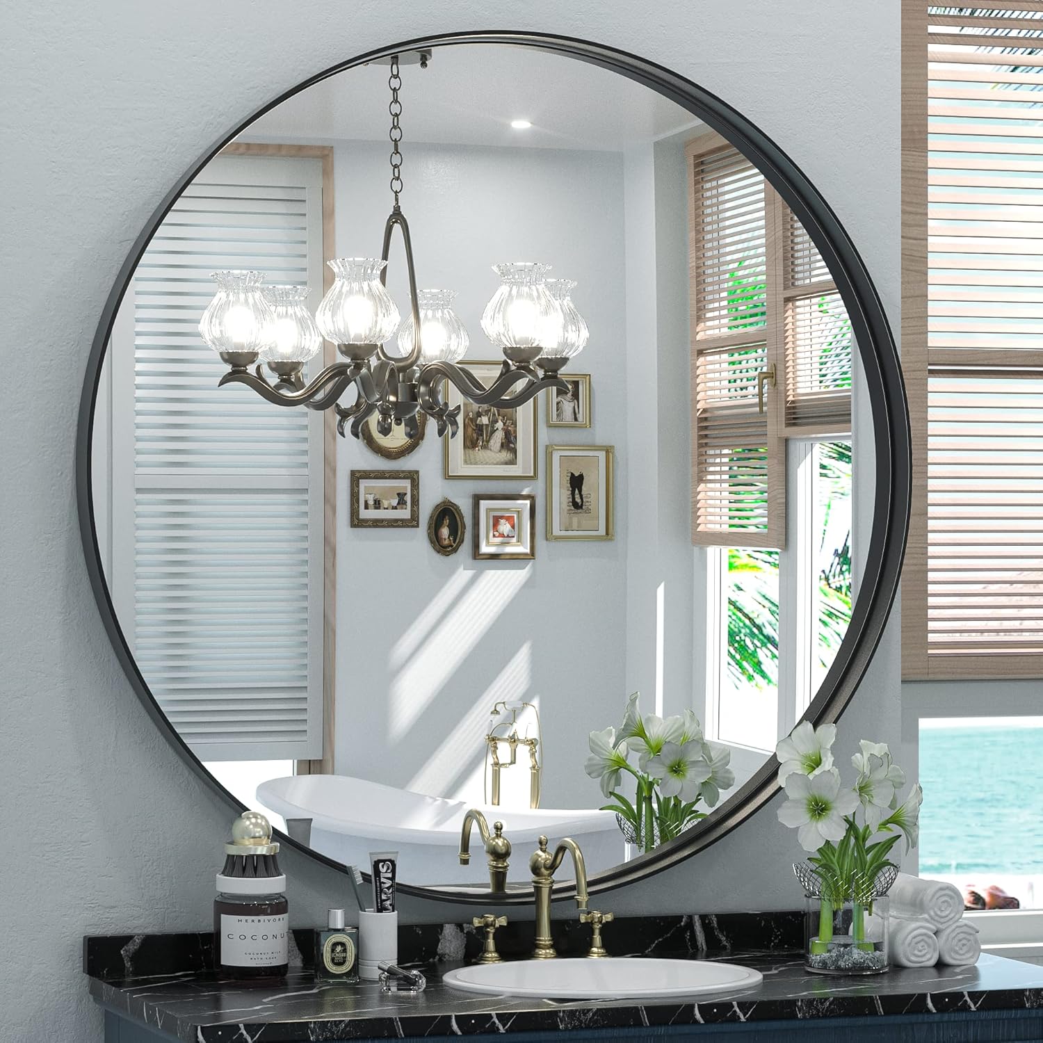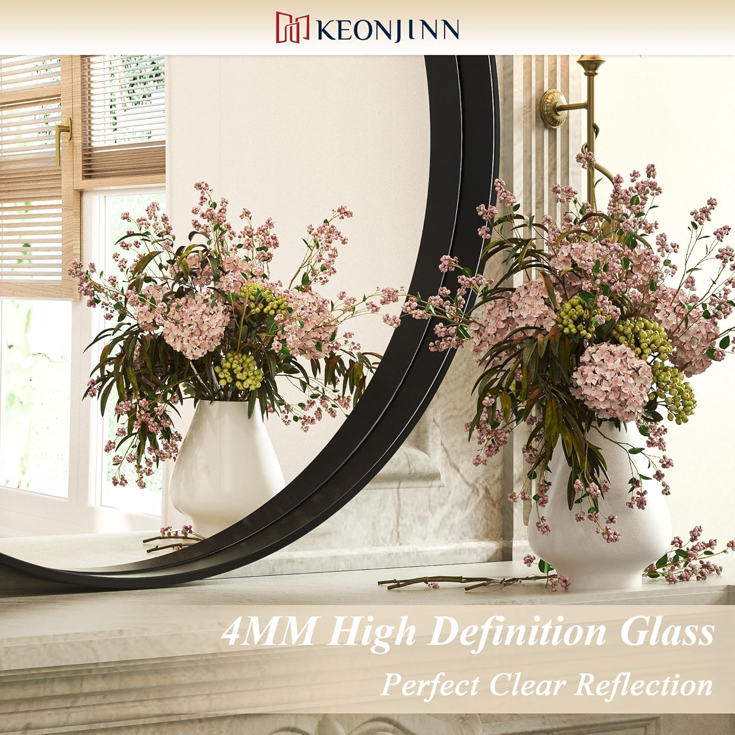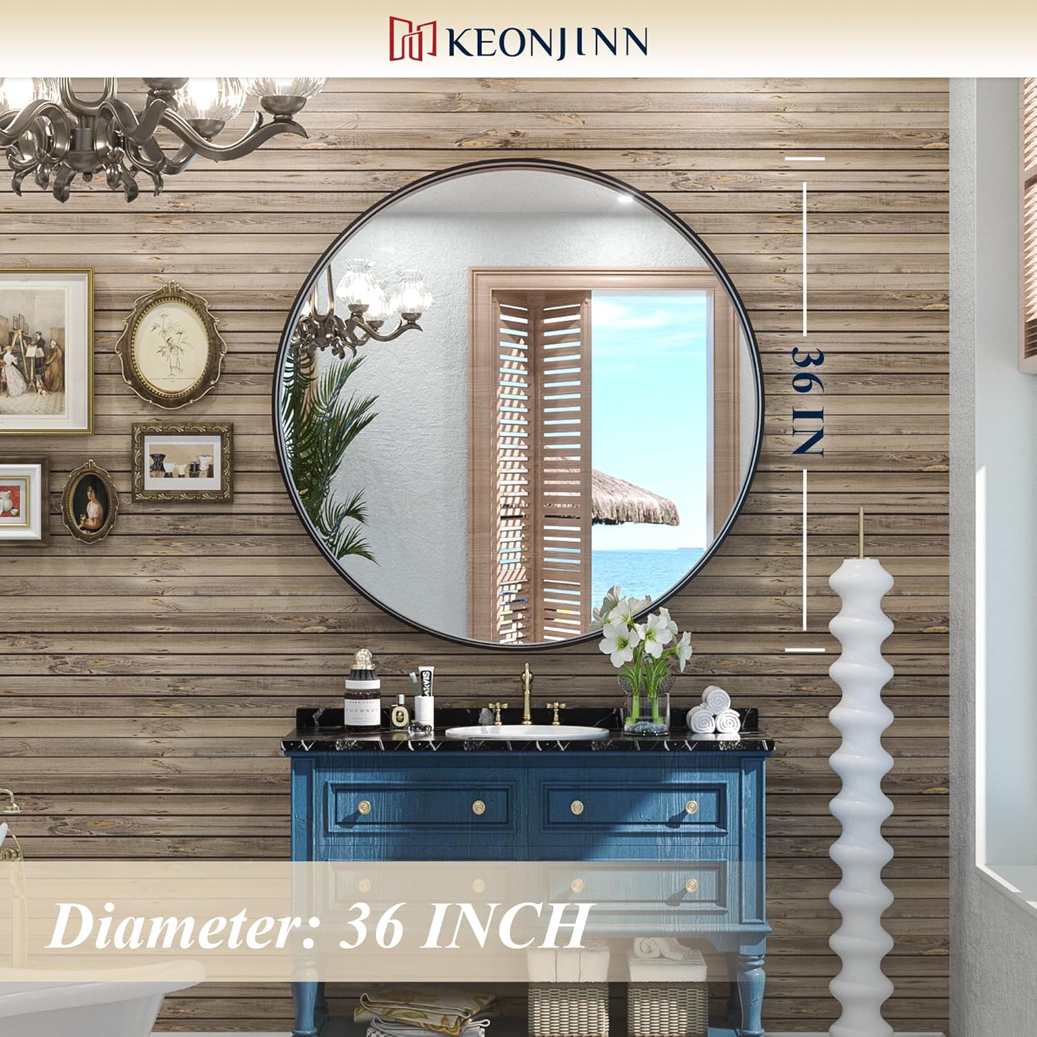 Keonjinn Black Round Mirror 36 Inch, Brushed Black Framed Circle Mirror for Bathroom, Aluminum Alloy Metal Frame, Modern Farmhouse Decorative Wall Mirror for Entryway, Living Room