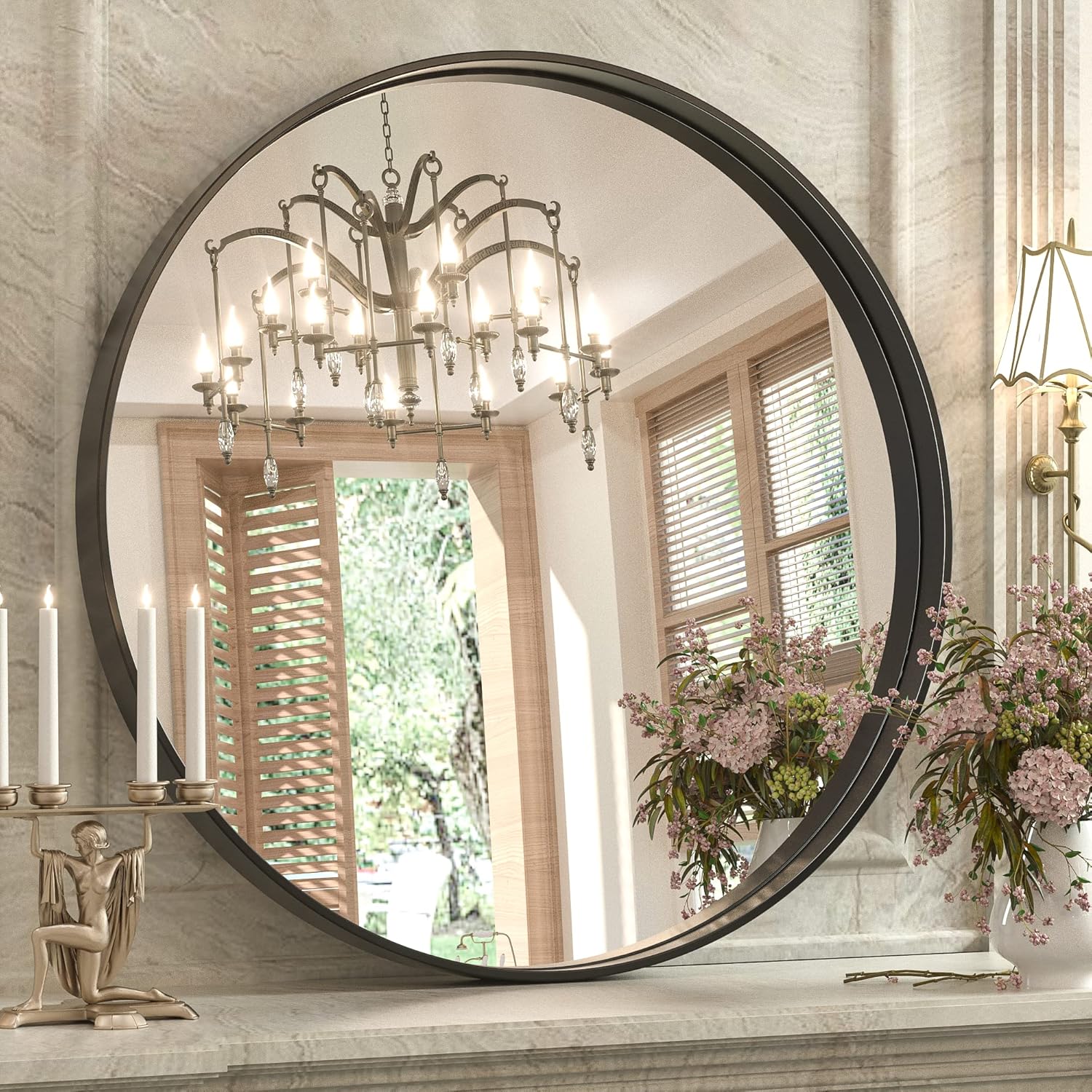 Keonjinn Black Round Mirror 24 Inch, Brushed Black Framed Circle Mirror for Bathroom, Aluminum Alloy Metal Frame, Modern Farmhouse Decorative Wall Mirror for Entryway, Living Room