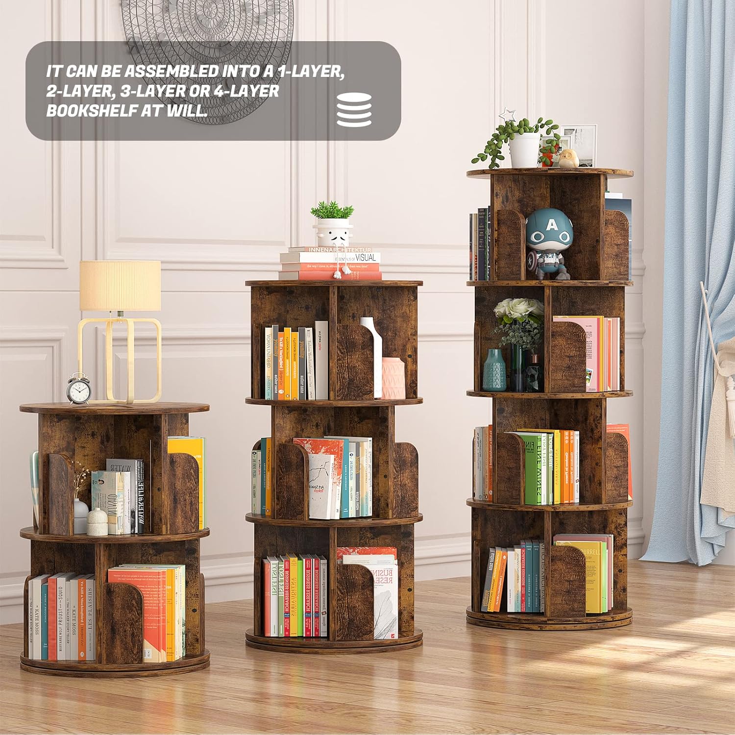 Aheaplus Rotating Bookshelf, Small Corner Bookshelf for Small Space, 360 Display 4 Tier Floor Standing Bookcase Storage Rack, Wood Narrow Book Shelf Organizer for Bedroom, Living Room, Rustic Brown