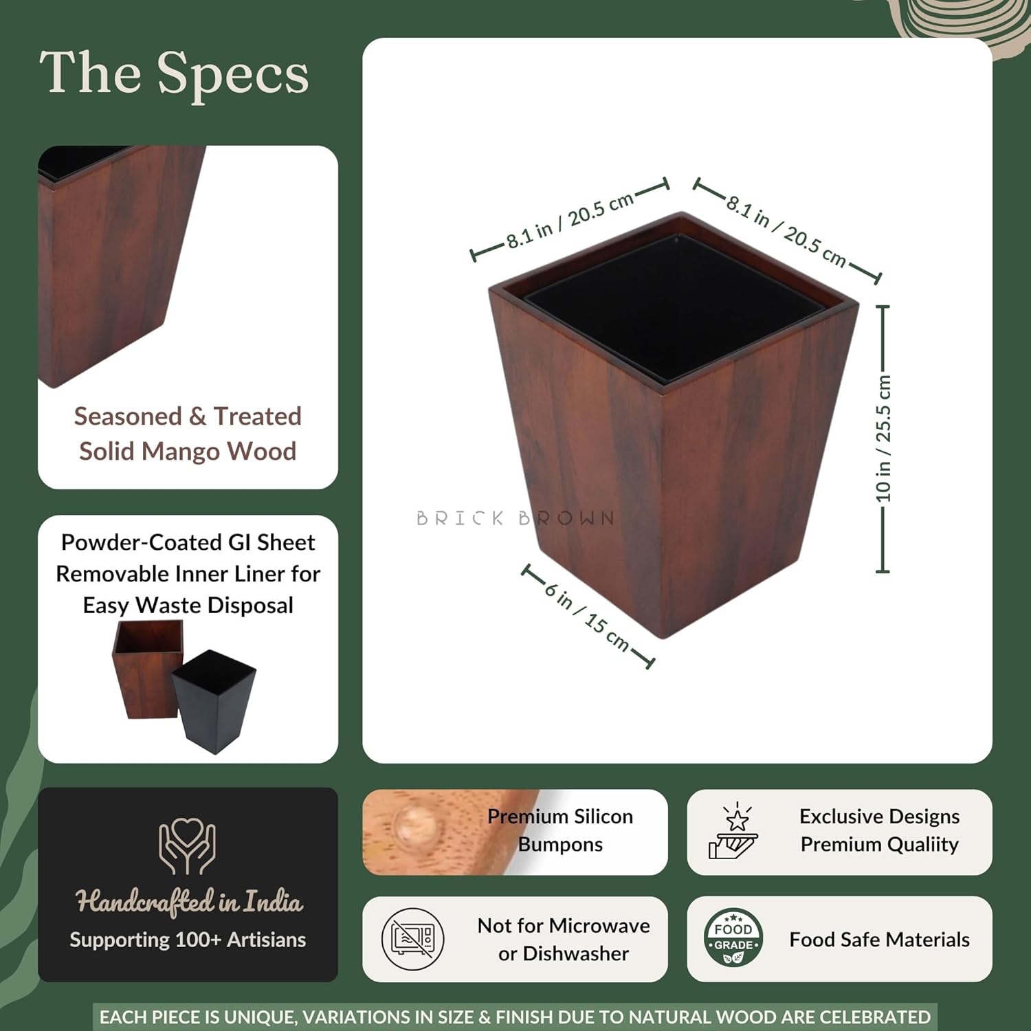 Premium Solid Wood Trashbin Multipurpose Furniture Basket for Home Living Room Office | Dustbin with Removal Metal Inner Liner from Mahogany Collection (Dwindle, 8x8x9.8 Inch)