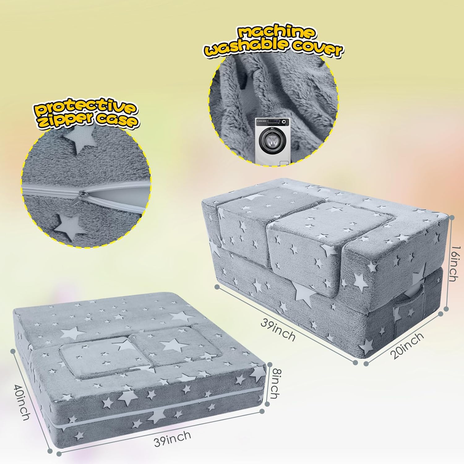 MeMoreCool Modular Kids Play Couch Sofa – Glow in The Dark Star Design, Fold-Out Toddler Couch for Playroom Furniture, Grey