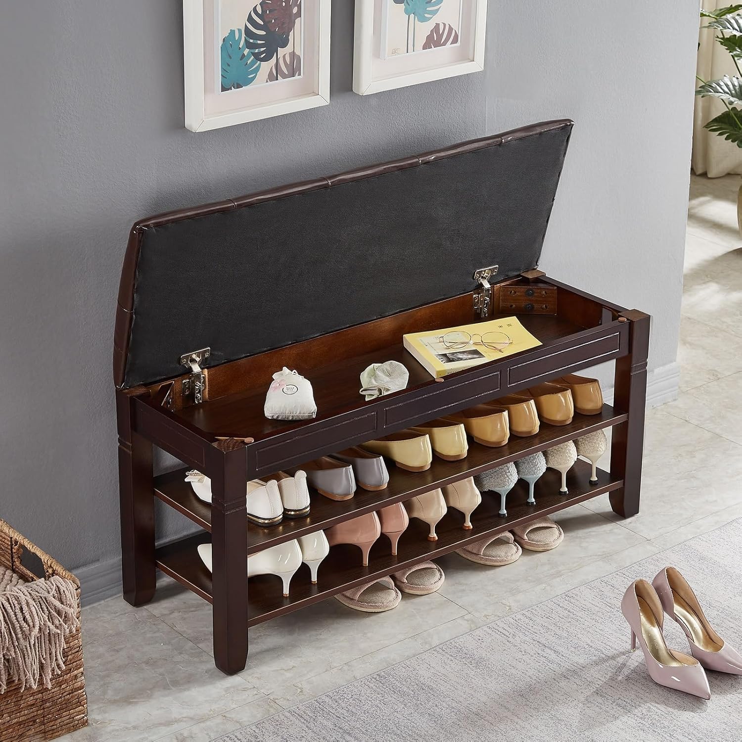 Shoe Storage Bench, Entryway Shoe Rack with Fiberleather Seat 2-Tier Lift Top Organizer Wooden Shoe Bench for Entryway Hallway Living Room (Dark Brown 39.4x13.8x18.9'')