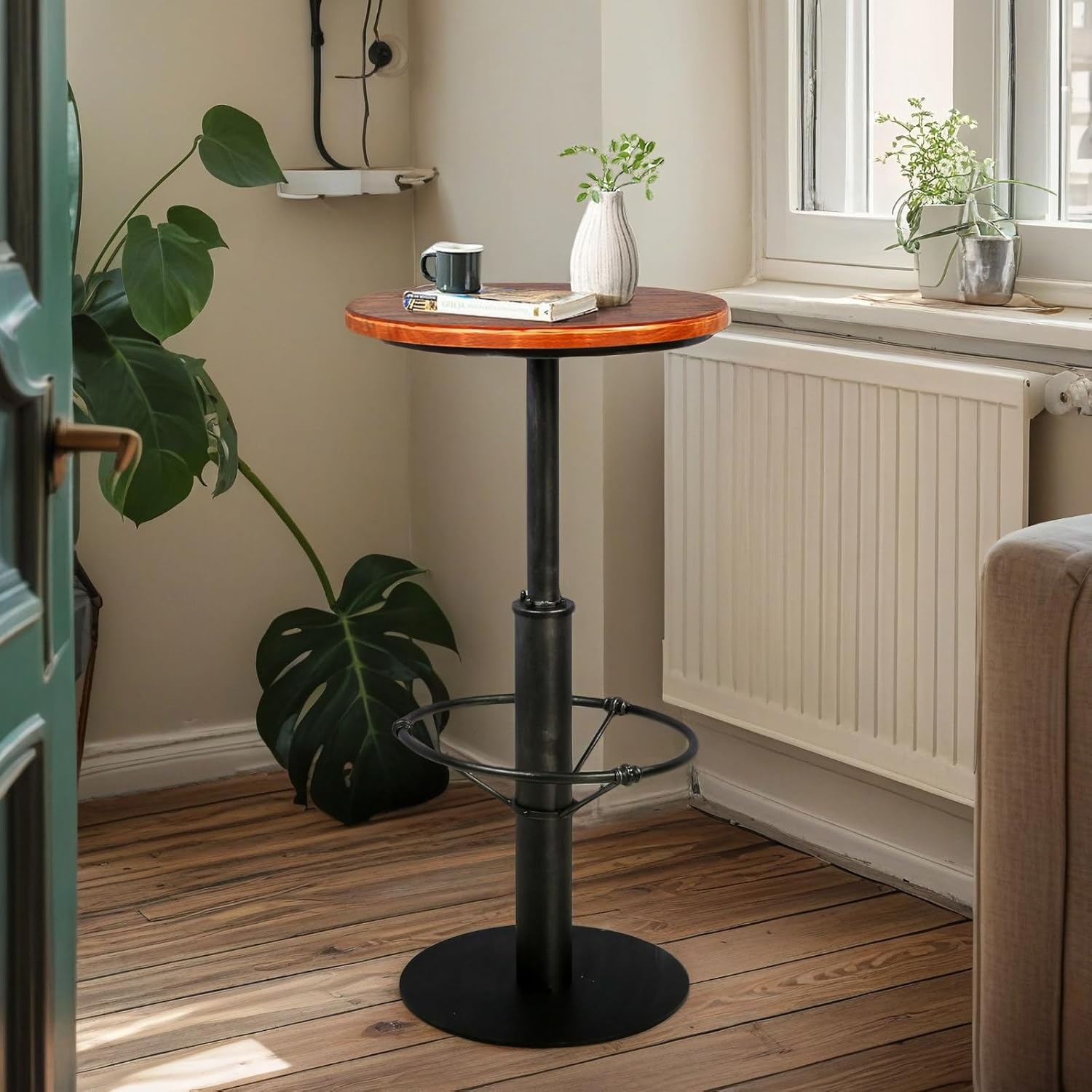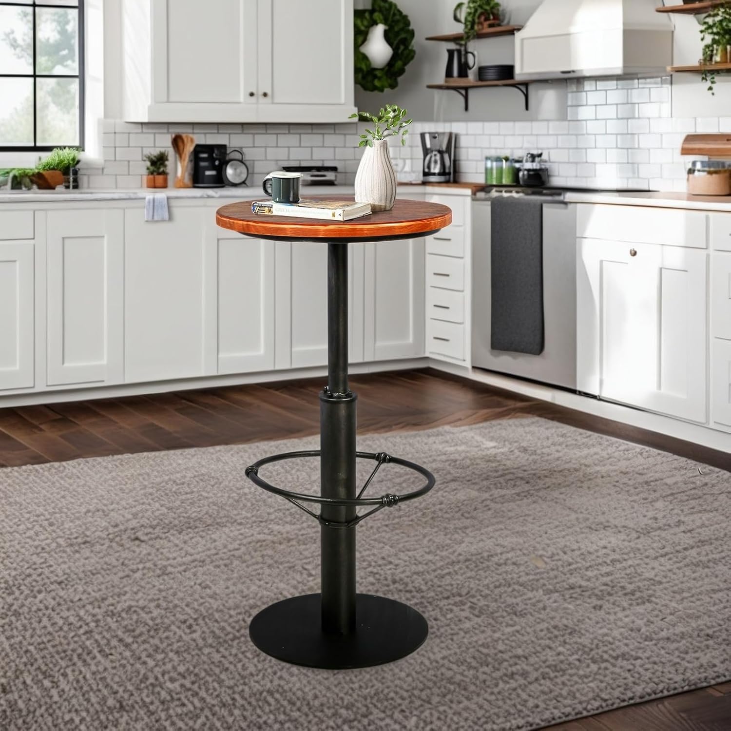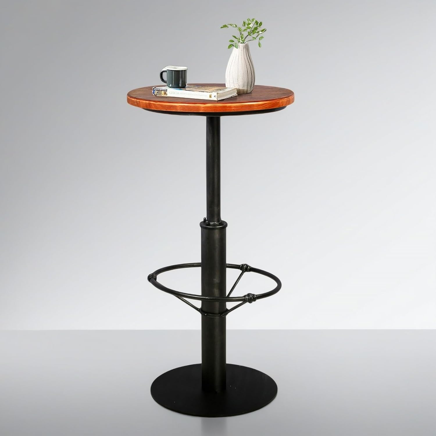 - 【PINE WOOD ROUND TABLE】 Table Top is constructed from Pine Wood, and the textured post & base is made from metal. Designed for narrow spaces with a 23.7" round table Top to allow for functionality & usability in any setting, adjustable footrest height.
