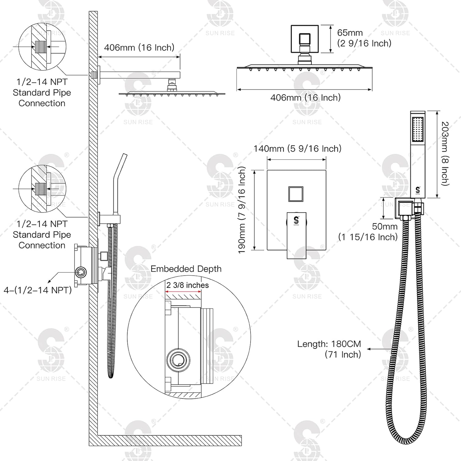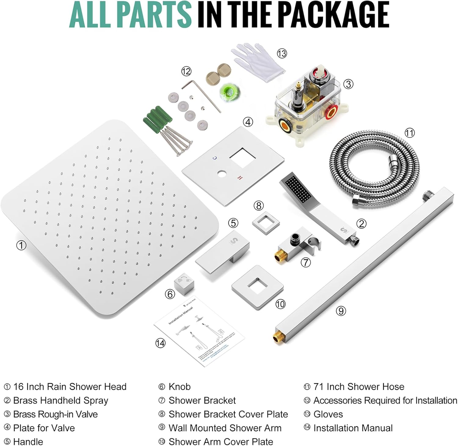 - Complete Shower System Included: This shower faucet set includes everything you need for a luxurious upgrade: a 16-inch rain shower head, a handheld shower head, a 71-inch shower hose, a 16-inch shower arm, a handheld bracket, a mixing valve, a panel, a handle, a mode knob, shower arm and bracket covers, and all necessary installation accessories.