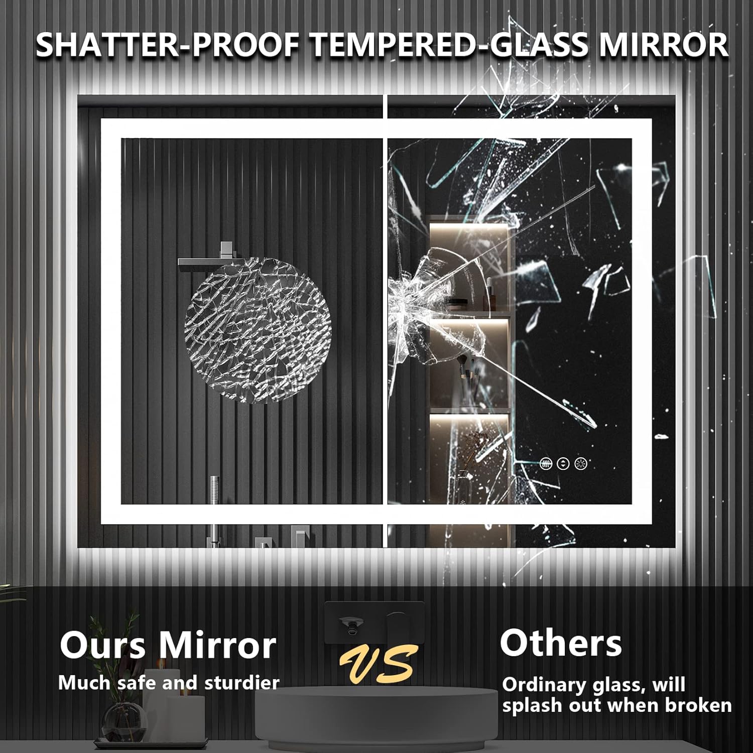 - 🔥【Anti-Fog/Defog, One Hour Auto-Off】- Are you still troubled by the fog on the mirror after shower? This anti-fog lighted bathroom mirrors wall mounted can free you from this trouble. Turn on the anti-fog function before showering can always maintain a clear reflection. Turn on the defogger after showering can quickly remove the water vapor on the mirror surface. No need to wipe the mirror after bathing, freeing your hands. The anti-fog function will auto turn off after one hour.