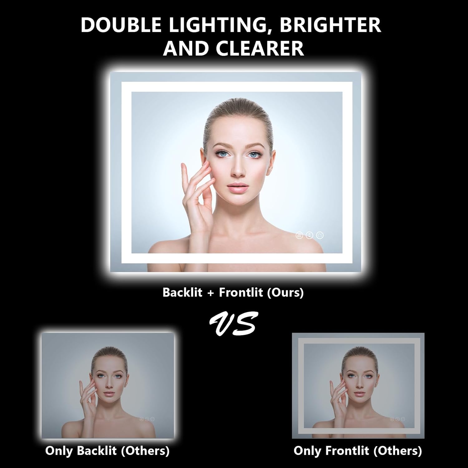 - 🔥【Anti-Fog/Defog, One Hour Auto-Off】- Are you still troubled by the fog on the mirror after shower? This anti-fog lighted bathroom mirrors wall mounted can free you from this trouble. Turn on the anti-fog function before showering can always maintain a clear reflection. Turn on the defogger after showering can quickly remove the water vapor on the mirror surface. No need to wipe the mirror after bathing, freeing your hands. The anti-fog function will auto turn off after one hour.