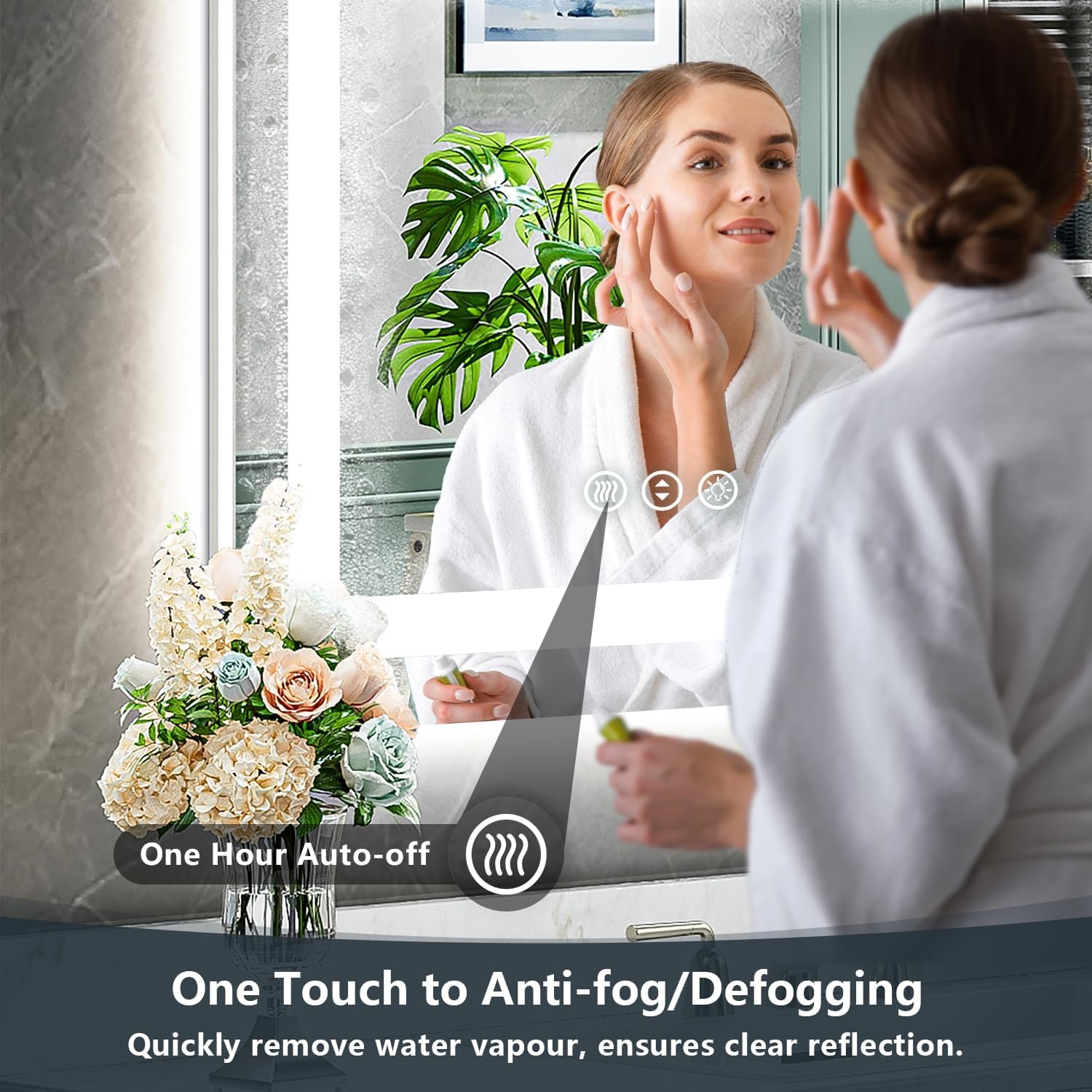 - 🔥【Anti-Fog/Defog, One Hour Auto-Off】- Are you still troubled by the fog on the mirror after shower? This anti-fog lighted bathroom mirrors wall mounted can free you from this trouble. Turn on the anti-fog function before showering can always maintain a clear reflection. Turn on the defogger after showering can quickly remove the water vapor on the mirror surface. No need to wipe the mirror after bathing, freeing your hands. The anti-fog function will auto turn off after one hour.