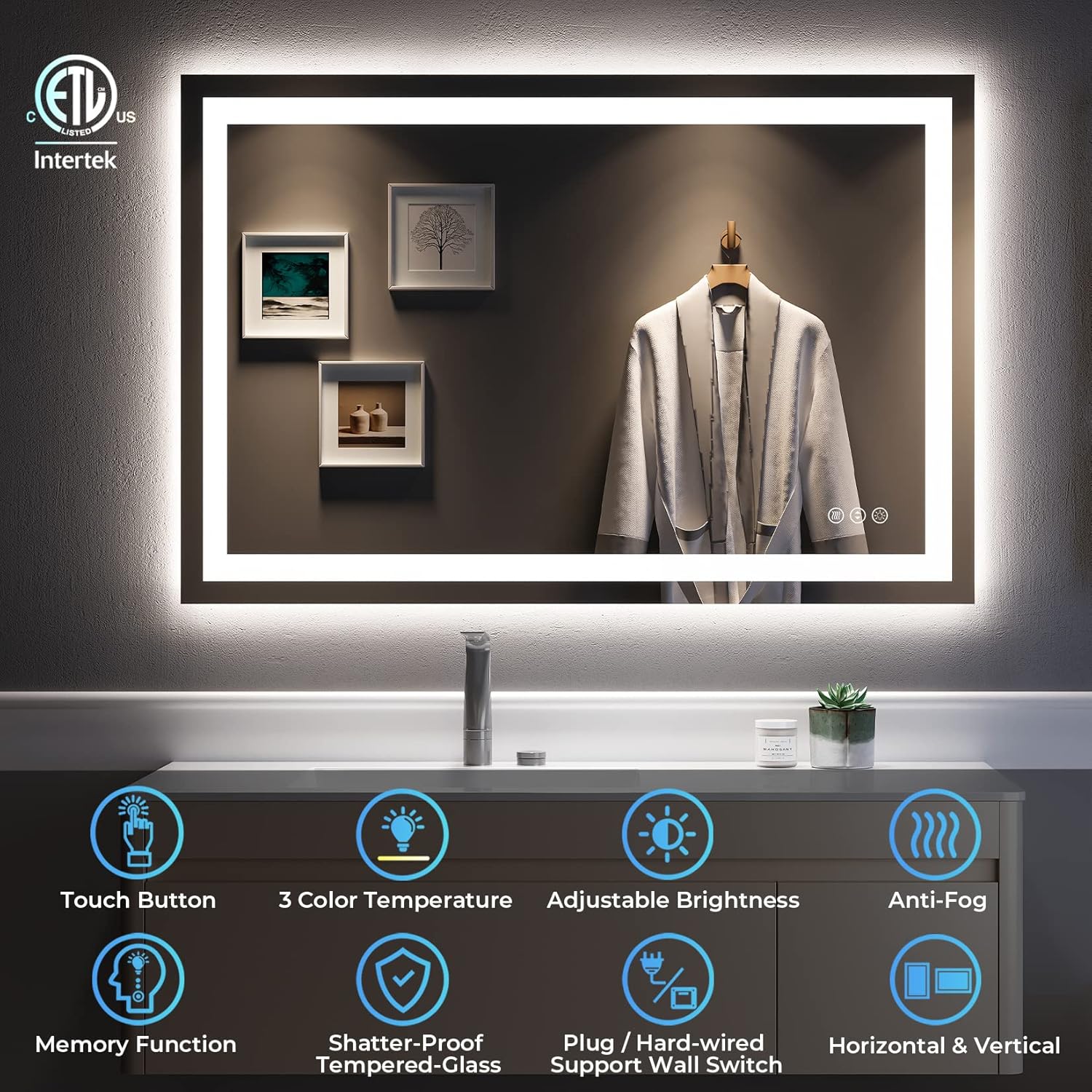 48x32 Inch LED Bathroom Mirror with Lights Front and Backlit Lighted Vanity Mirror for Bathroom Wall with 3 Colors Dimmable Anti-Fog Memory Shatter-Proof IP54 Waterproof Horizontal/Vertical