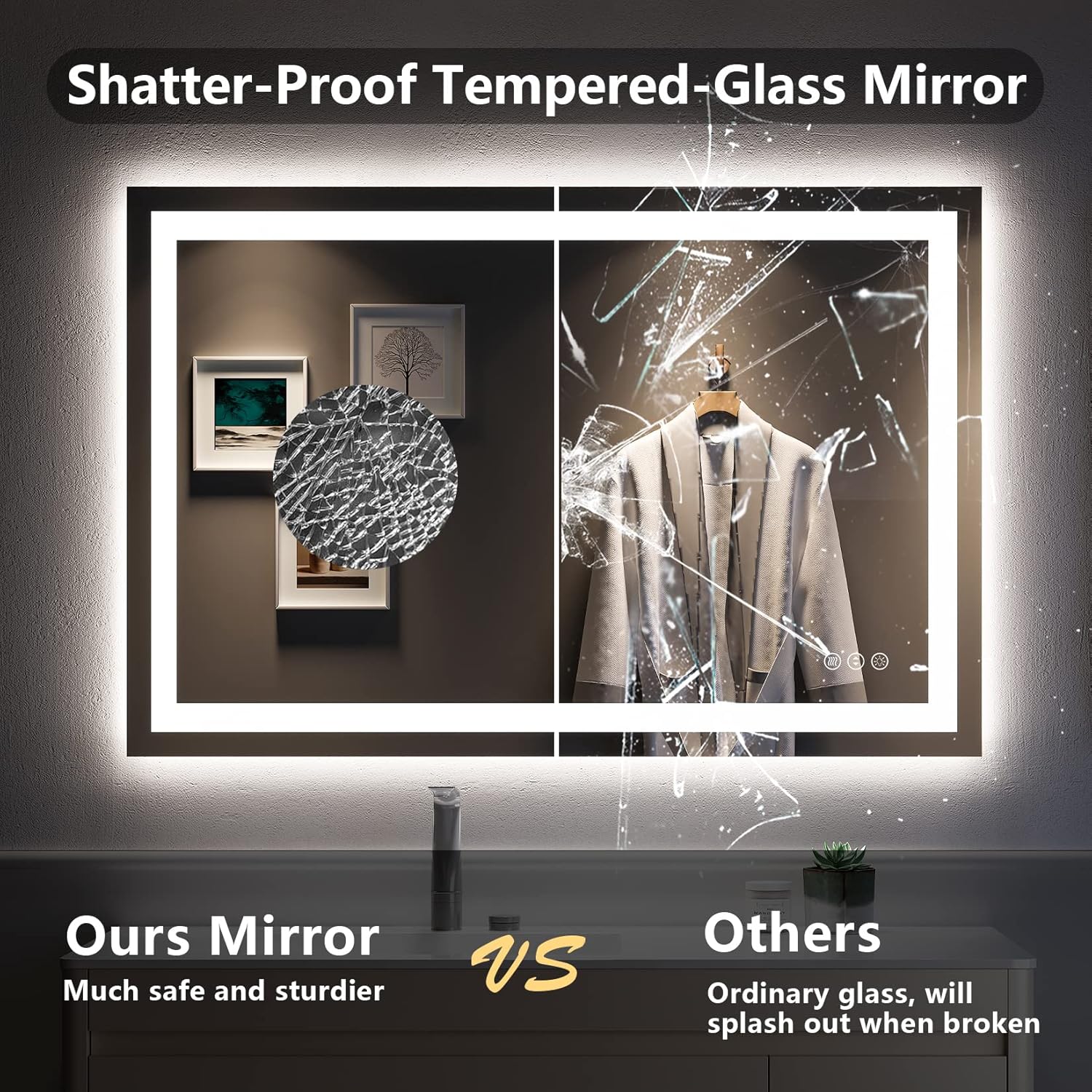- 🔥【Anti-Fog/Defog, One Hour Auto-Off】- Are you still troubled by the fog on the mirror after shower? This anti-fog lighted bathroom mirrors wall mounted can free you from this trouble. Turn on the anti-fog function before showering can always maintain a clear reflection. Turn on the defogger after showering can quickly remove the water vapor on the mirror surface. No need to wipe the mirror after bathing, freeing your hands. The anti-fog function will auto turn off after one hour.