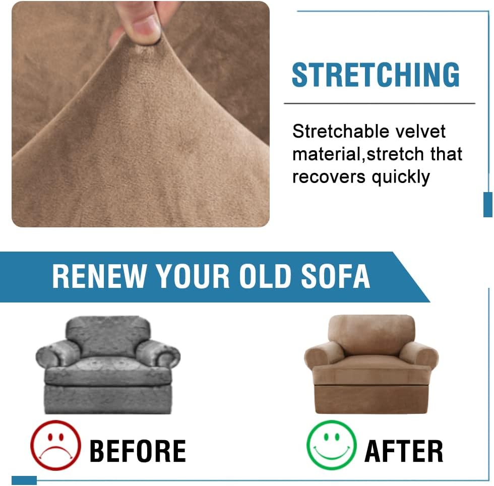 H.VERSAILTEX Sofa Cover 2 Piece T Cushion Armchair Slipcovers Thick Velvet Couch Cover Furniture Protector Stretch T Cushion Sofa Covers for 1 Cushion Couch with 1 Individual T Cushion Covers, Camel