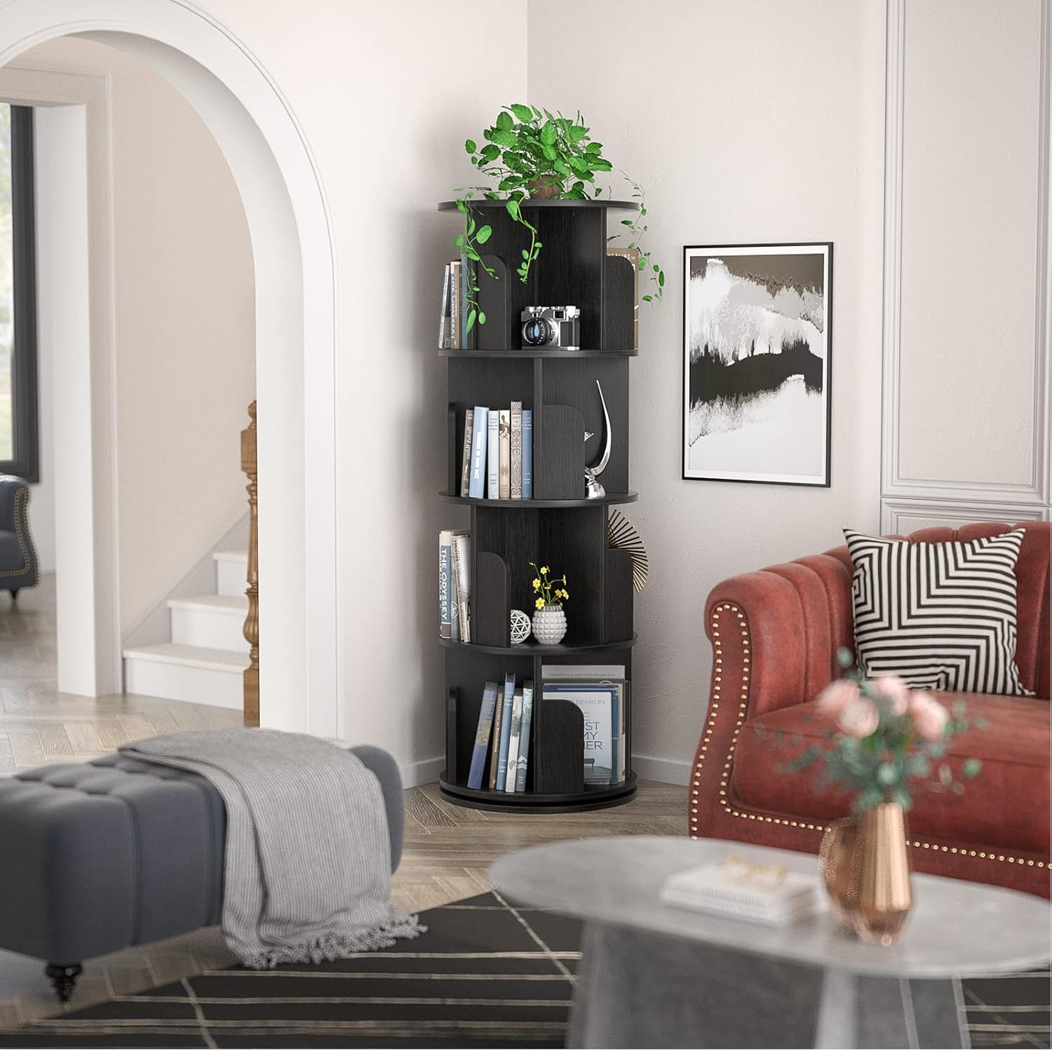 Aheaplus Rotating Bookshelf, 360 Revolving Bookshelf Tower for Small Space, 4 Tier Floor Standing Bookcase Storage Rack, Wood Narrow Book Shelf Organizer for Bedroom, Living Room, Study Room, Black