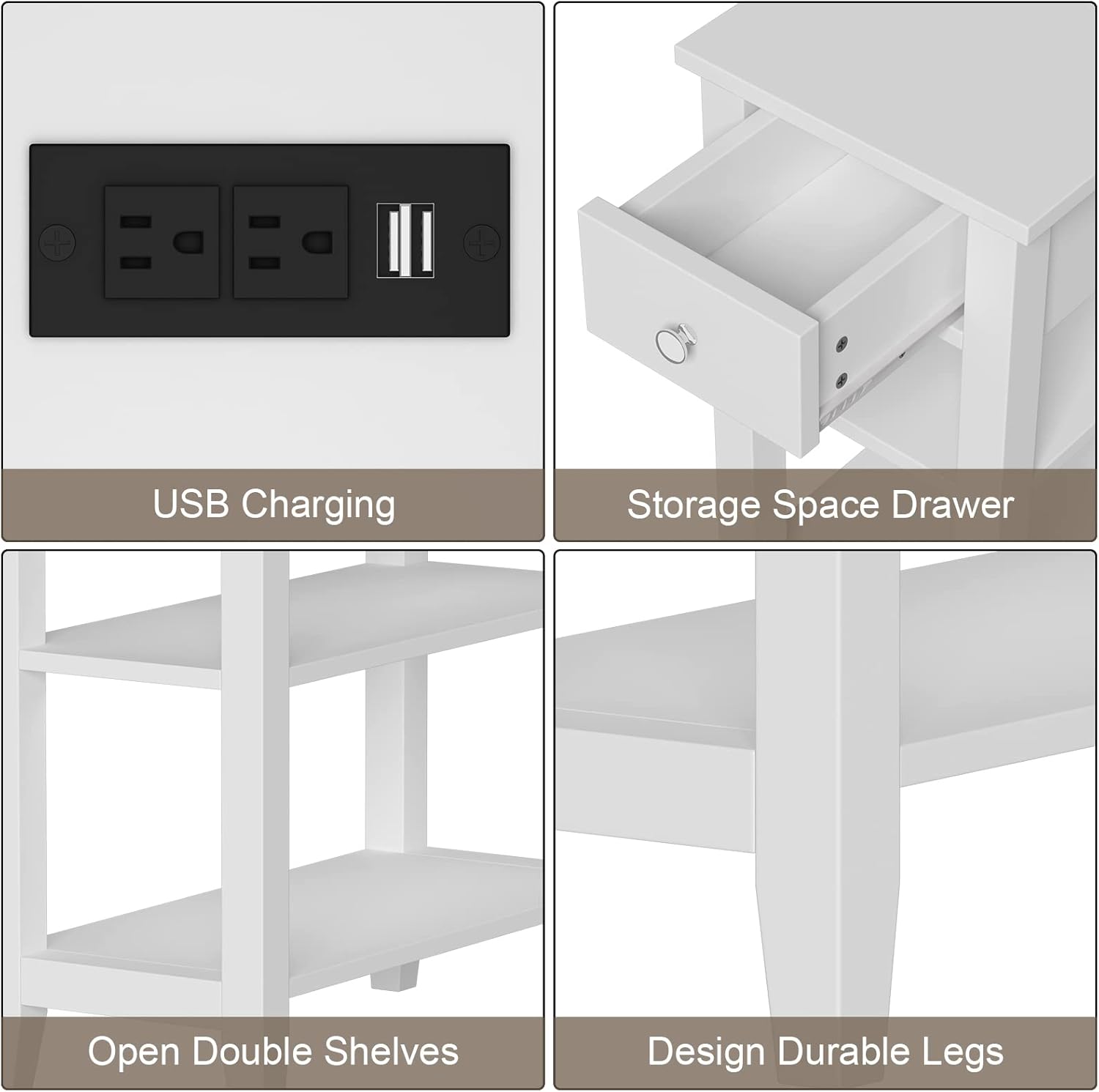 ChooChoo Narrow End Table with Charging Station, Side Table Living Room with USB Ports & Power Outlets and Hidden Drawer, 3-Tier Skinny Nightstand with 2 Open Storage Shelves for Small Place (White)
