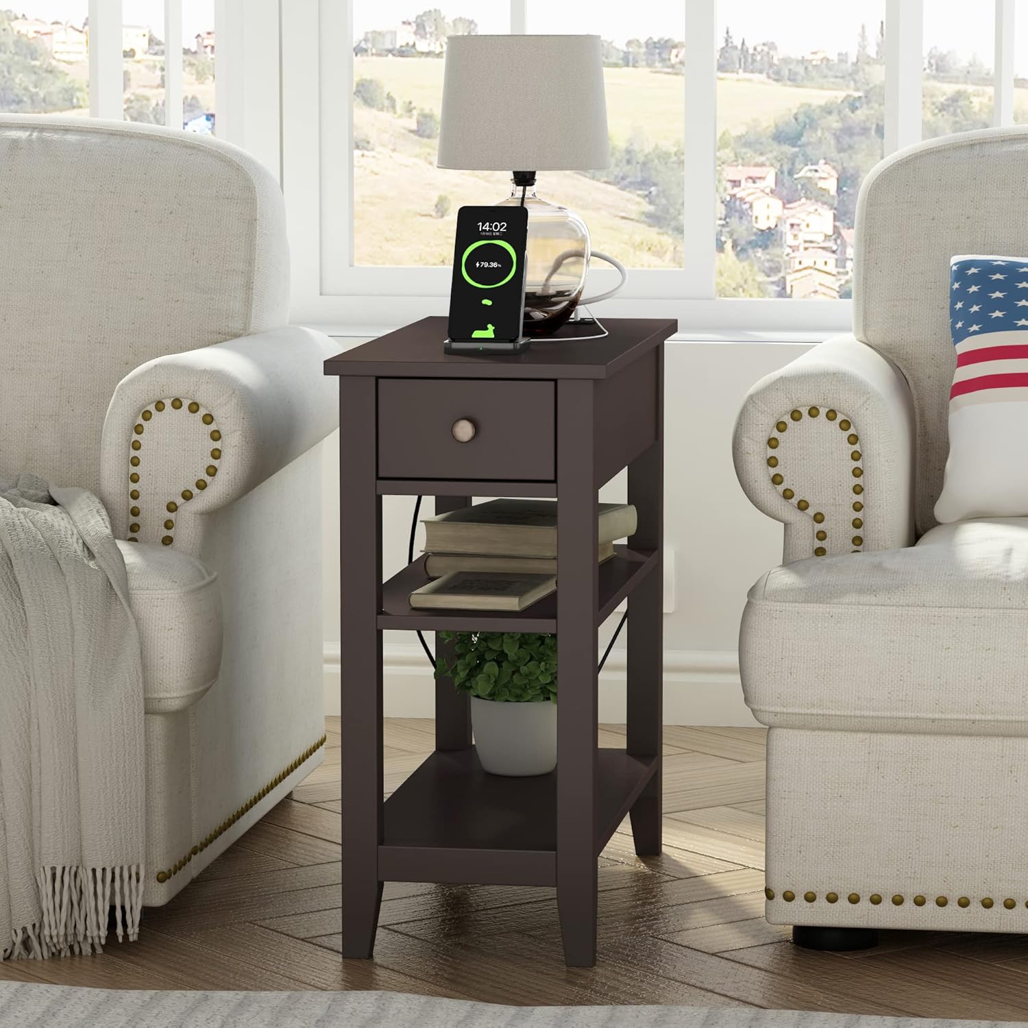 - 【End Table with Charging Station】With this narrow side table achieving charging freedom, this end tables living room includes 2 standard outlets and 2 USB ports can easily charge your desk lamp, cell phone, tablet PC or electrical appliances needs, different plugs that can be used together will save your time, sufficient 6.5 ft cord length for more placement options