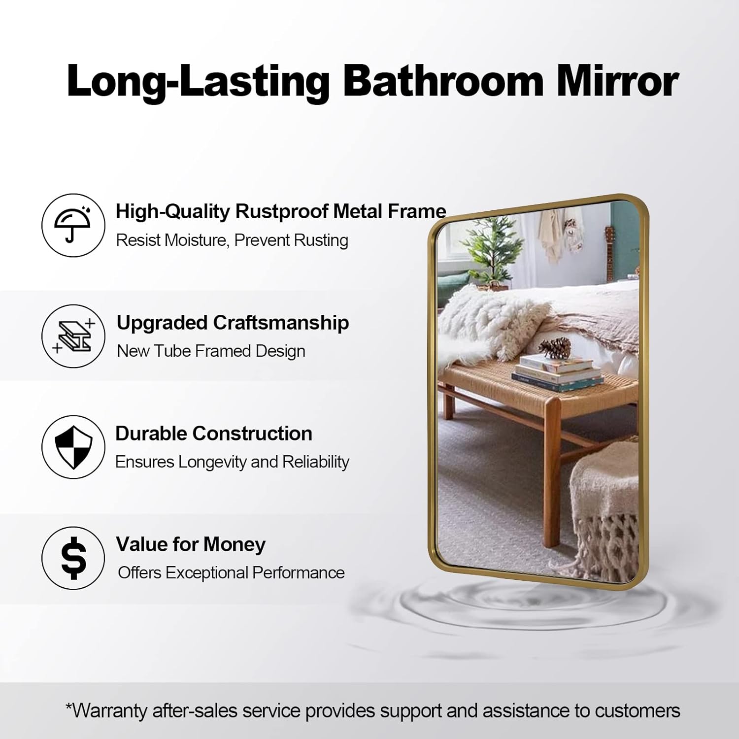 - 22x30 Brass Bathroom Mirror Ideal for Home: This 22x30 rounded gold mirror is the ideal medium size for your space. With our unique beauty rounded frame design, it could definitely be the one for your space. The tube metal frame design with sophistication brass finish could match any decoration style. Let this gold bathroom mirror add the light and enhance the beauty in your home instantly