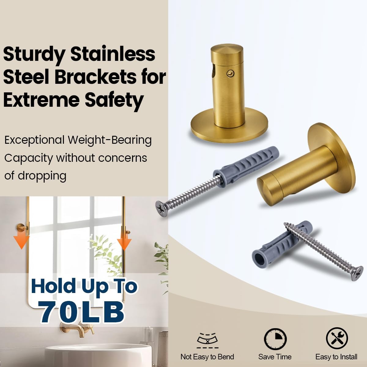 - PREMIUM MATERIALS: Top materials ensure durability; Gold tilting mirror has a stainless steel frame with electro-plated finish, TSCA-certified MDF backboard, and electronic-grade glass. Tilt mirror is sturdy, stable, and safe for bathrooms