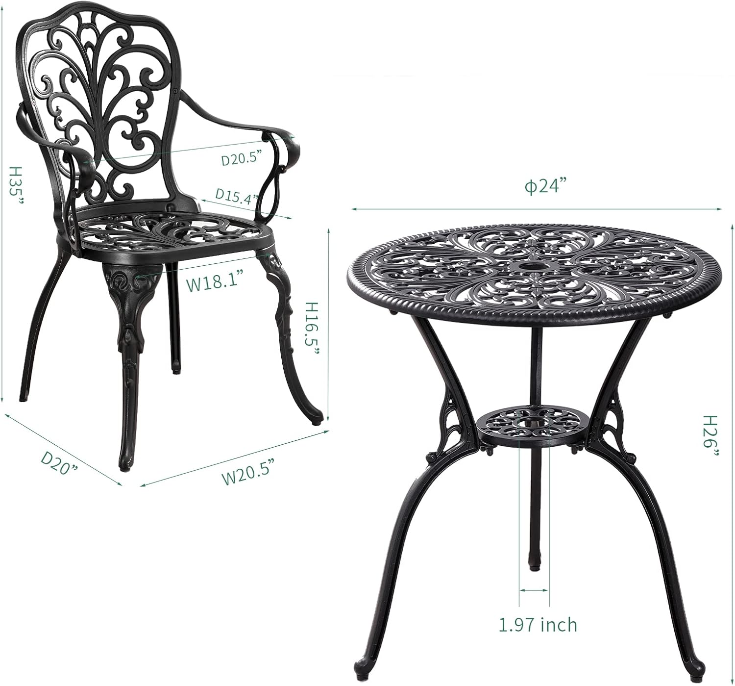 - 【Fit an Umbrella】1.97" Umbrella Hole on the bistro table set can be filled with a patio umbrella (not included), protecting you from the UV and rain. heavy duty cast aluminum frame and smooth edge detail providing you with peace of mind. With its perfect size, this bistro table set is an excellent addition to your outdoor space.