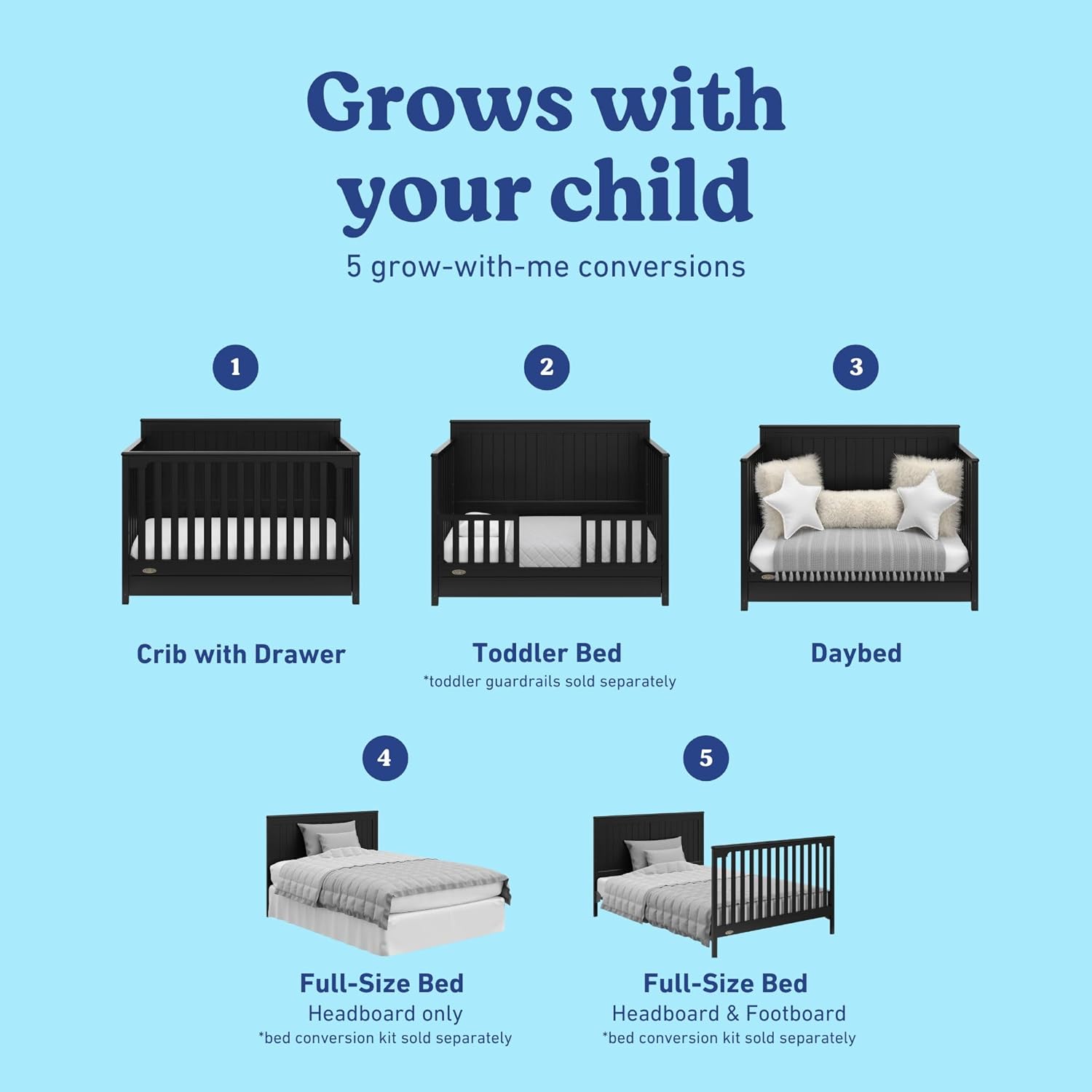 - 5-IN-1 CONVERTIBLE CRIB: Converts from baby crib (mattress sold separately) to toddler bed (compatible toddler guardrails sold separately), daybed, and full-size bed with headboard & optional footboard (conversion kit sold separately); Assembly required