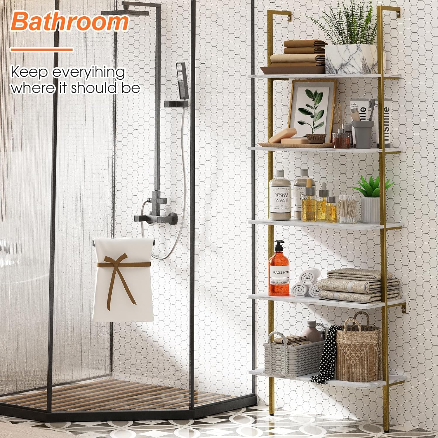 5 Tiers Ladder 2-Piece Shelf White Marble Modern Bookshelf Open Tall Wall Mount Bookcase Standing Leaning Wall Shelves Industrial Decorative