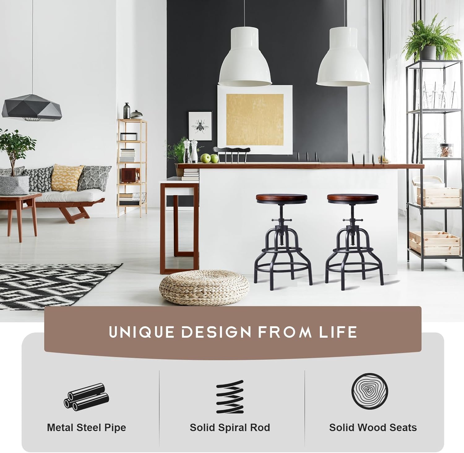 LOKKHAN Vintage Industrial Bar Stool - Rustic Swivel - Round Wood Metal - Kitchen Counter Height Adjustable - Pipe Stool - Cast Steel - 20-27 Inch (Set of 2)