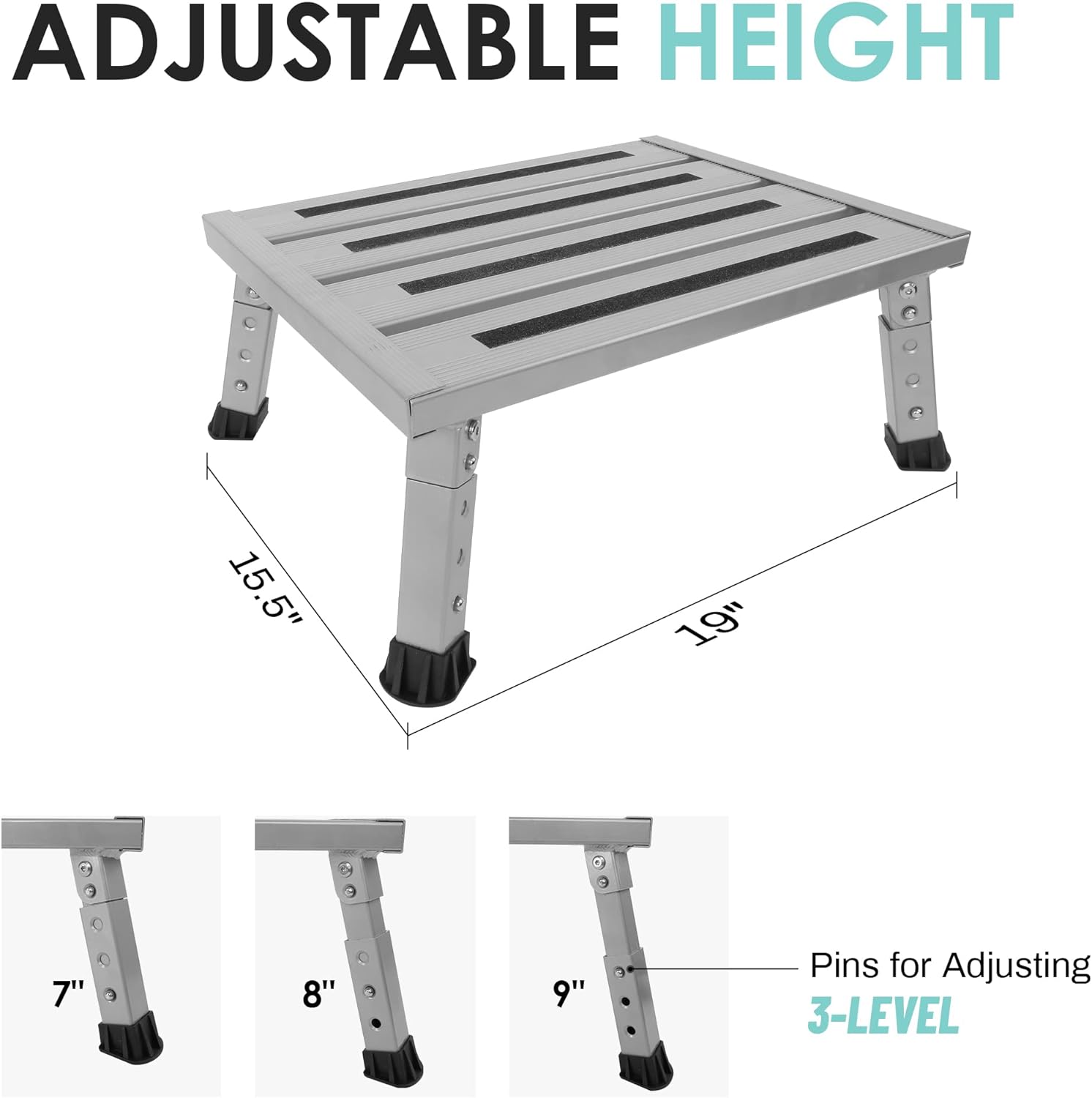 Adjustable Height Aluminum RV Step, Stable Foldable Platform Step Stool, Supports Up to 1,000 lb, Non-Slip Rubber Feet and Platform Mat, Easy to Carry (Silver)