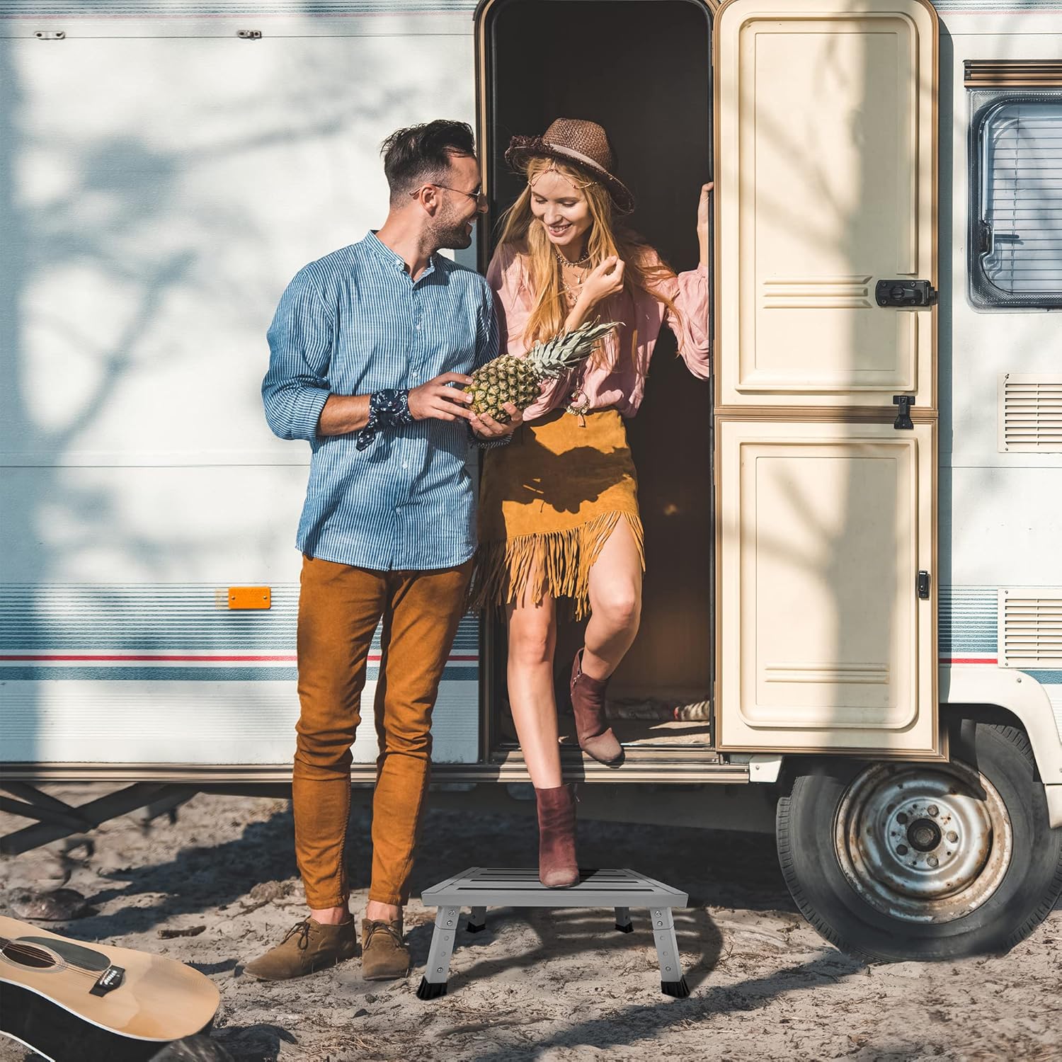 - EASY IN & OUT RV: Folding adjustable step stool with full metal construction. The right step for children, elderly people to get in and out your RV, motorhome, trailers, truck, SUV . Very stable and easy to carry