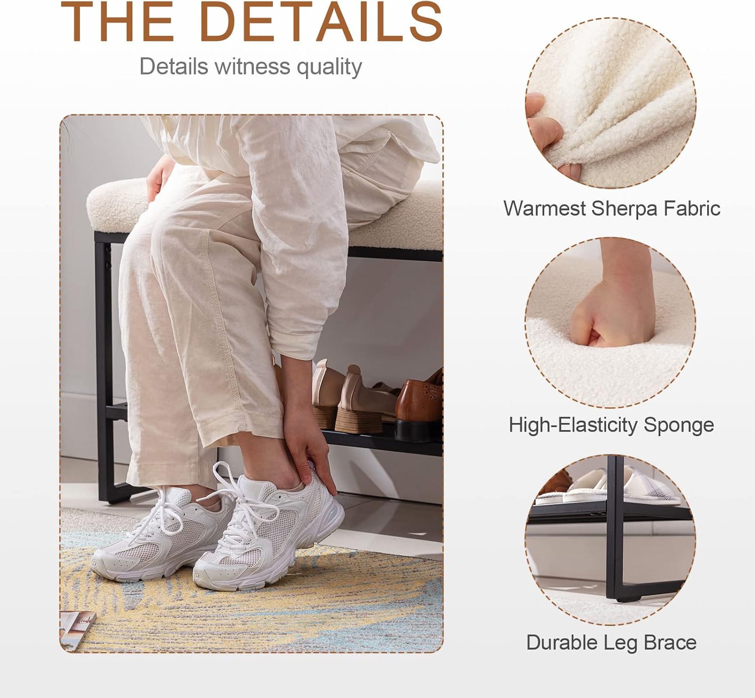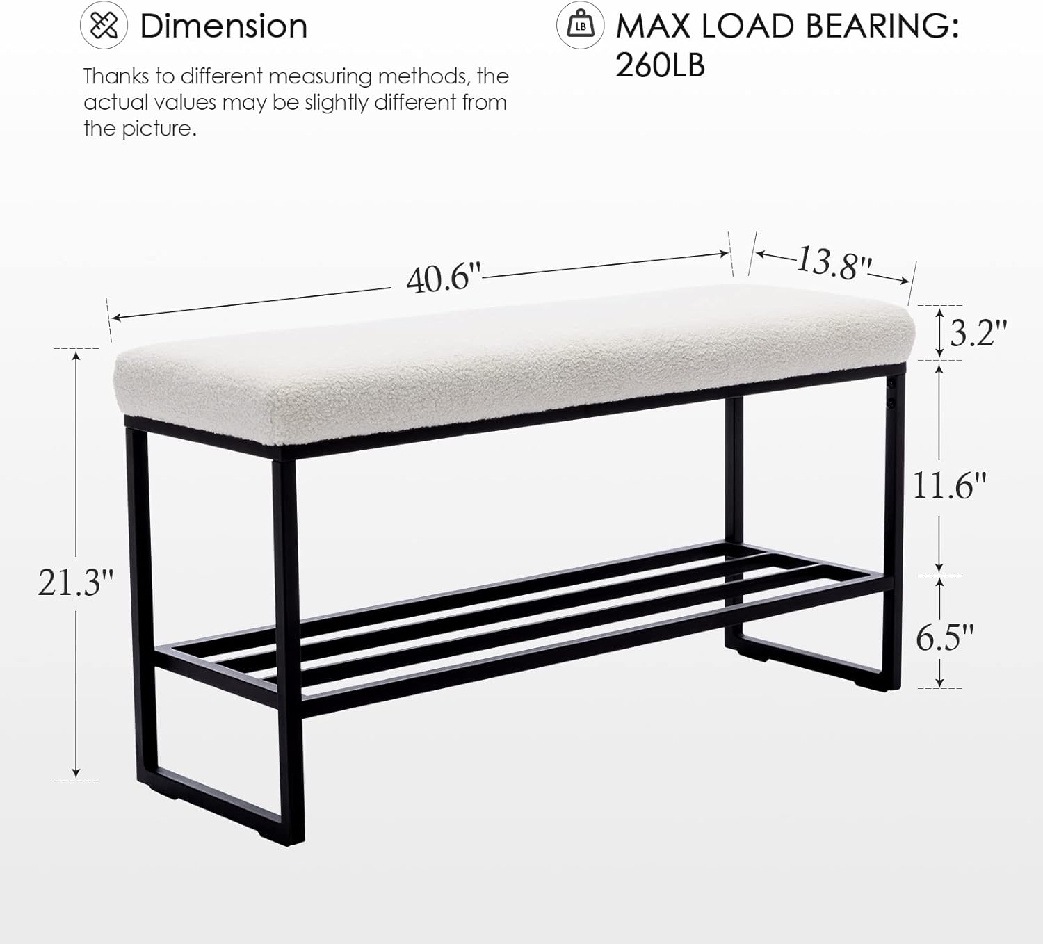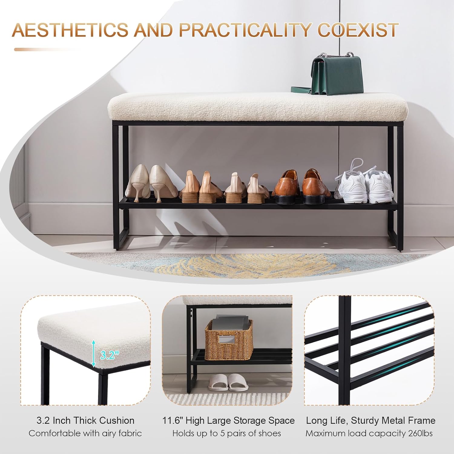 Zesthouse Boucle Shoe Bench Entryway with Storage, Upholstered Bench for Bedroom End of Bed, Metal Shoe Rack for Closet Hallway Doorway Living Room Mudroom, White