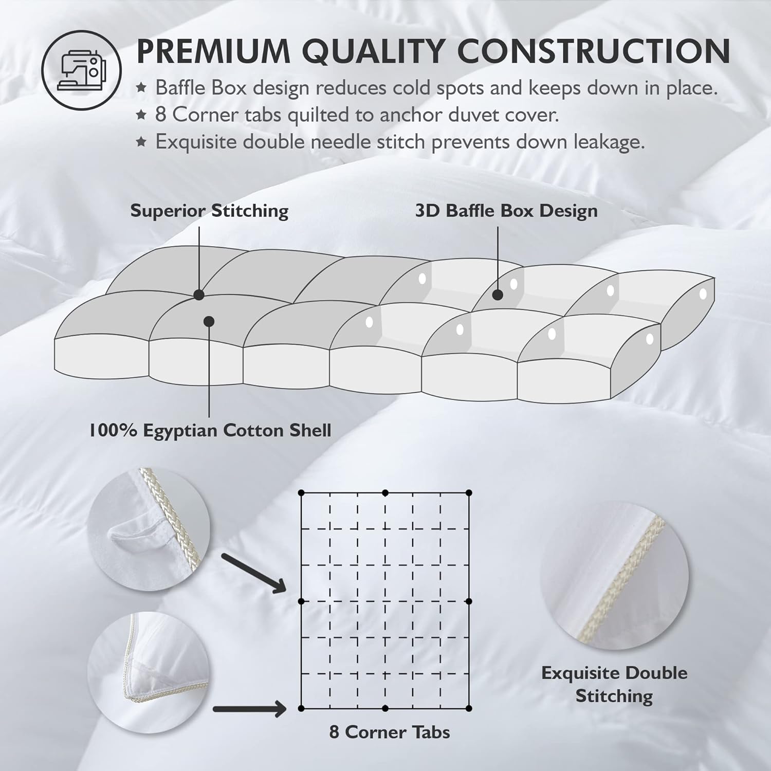- Premium Baffle Box design construction & Solid detailing avoids shifting of down and allows maximum loft and warmth. Loops and sewn corner tabs are designed to secure duvet cover in place.