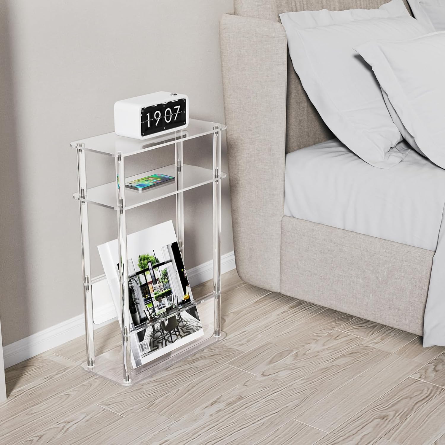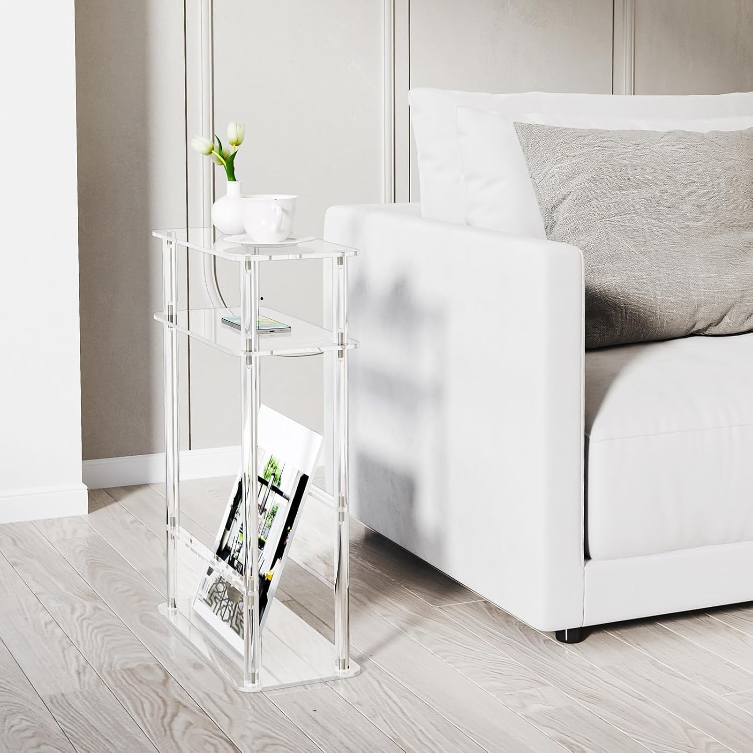 HMYHUM Acrylic Narrow End Table for Small Spaces with Magazine Holder, Slim Side Small Nightstand/Bedside Table for Living Room, Bedroom, 3 Tier, 15.7" L x 7" W x 23" H, Clear