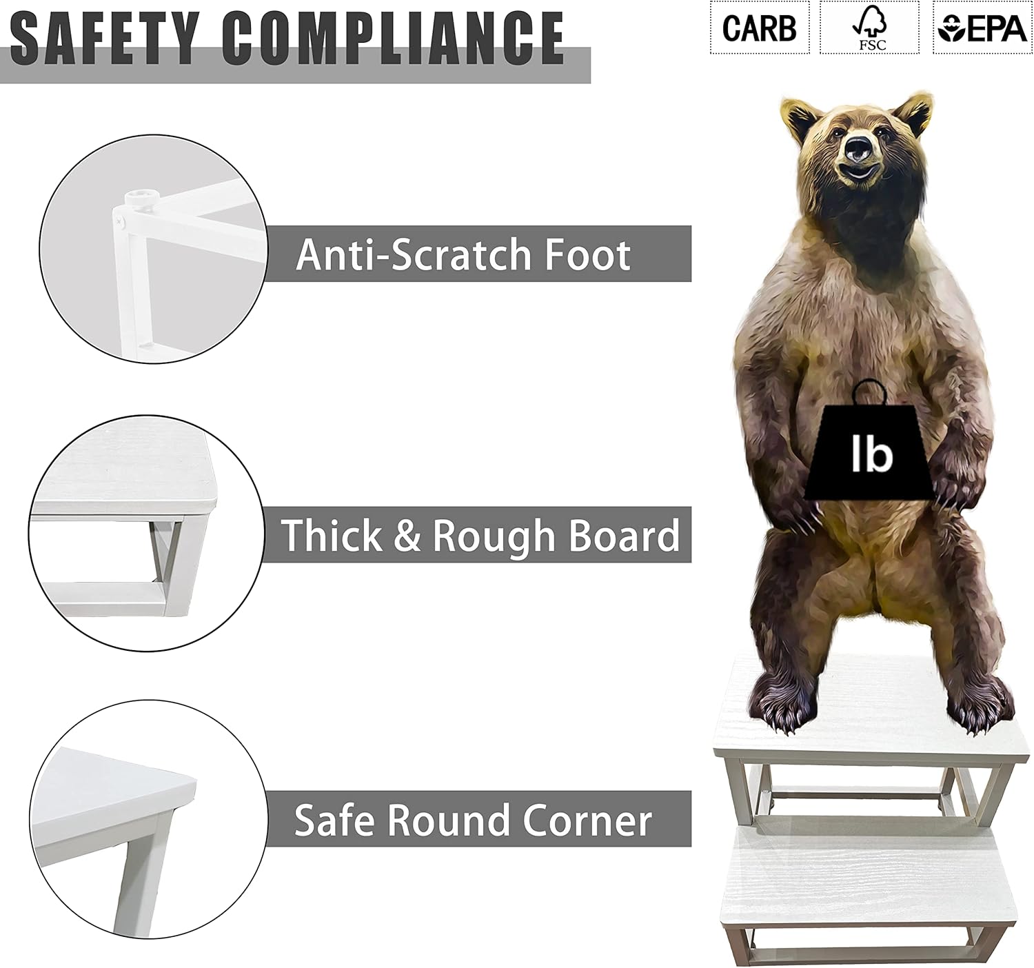 Nursery Step Stool, Wooden and Metal Foot Stool for Adult Kid, Steps for High Beds with Round Corners, Small Stepping Stool for Bedroom Kitchen, Load 500 LB, White