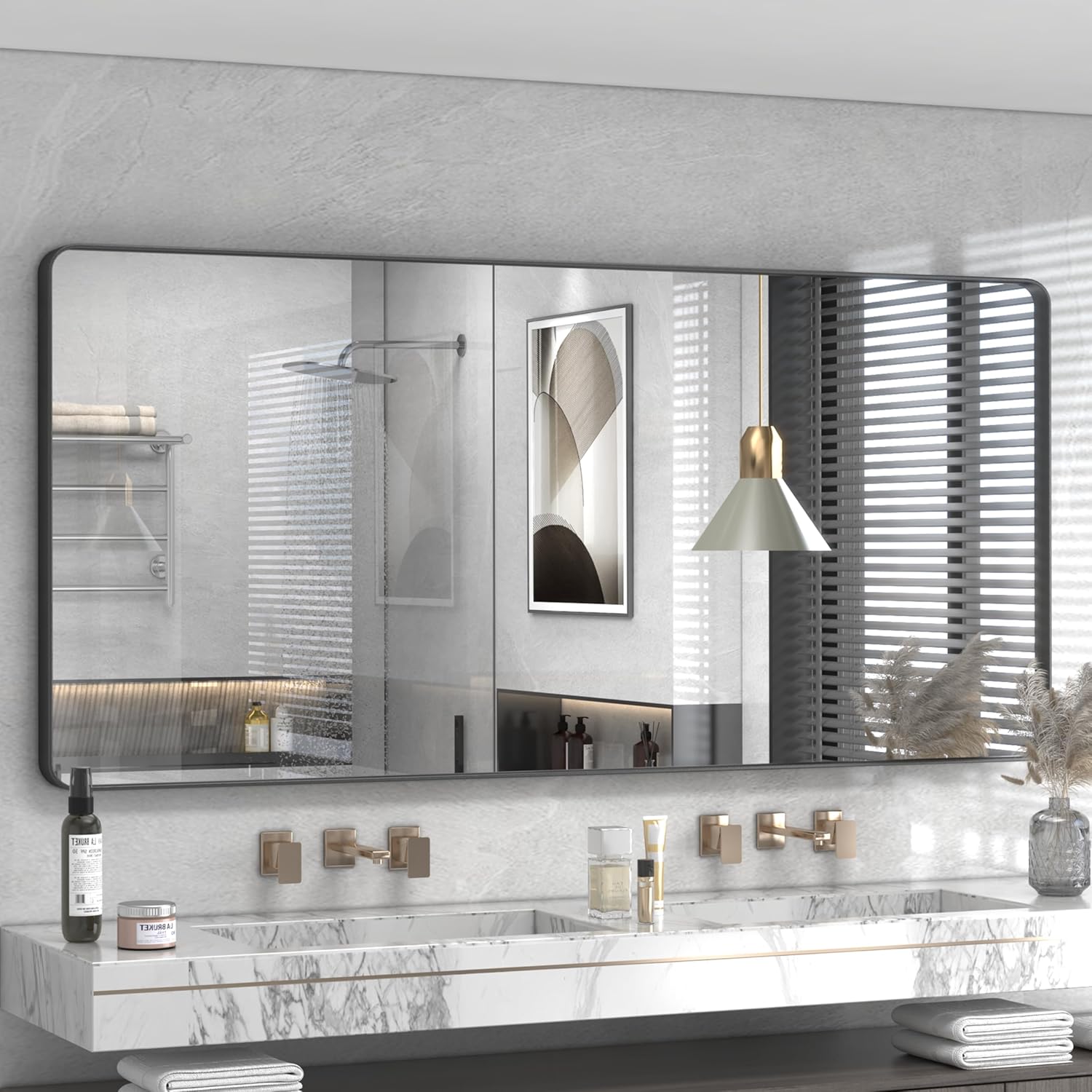 60x28 Black Framed Bathroom Mirror, Large Matte Black Bathroom Vanity Mirror for Wall, Rounded Rectangle Bathroom Mirror, Shatterproof (Horizontally/Vertically)