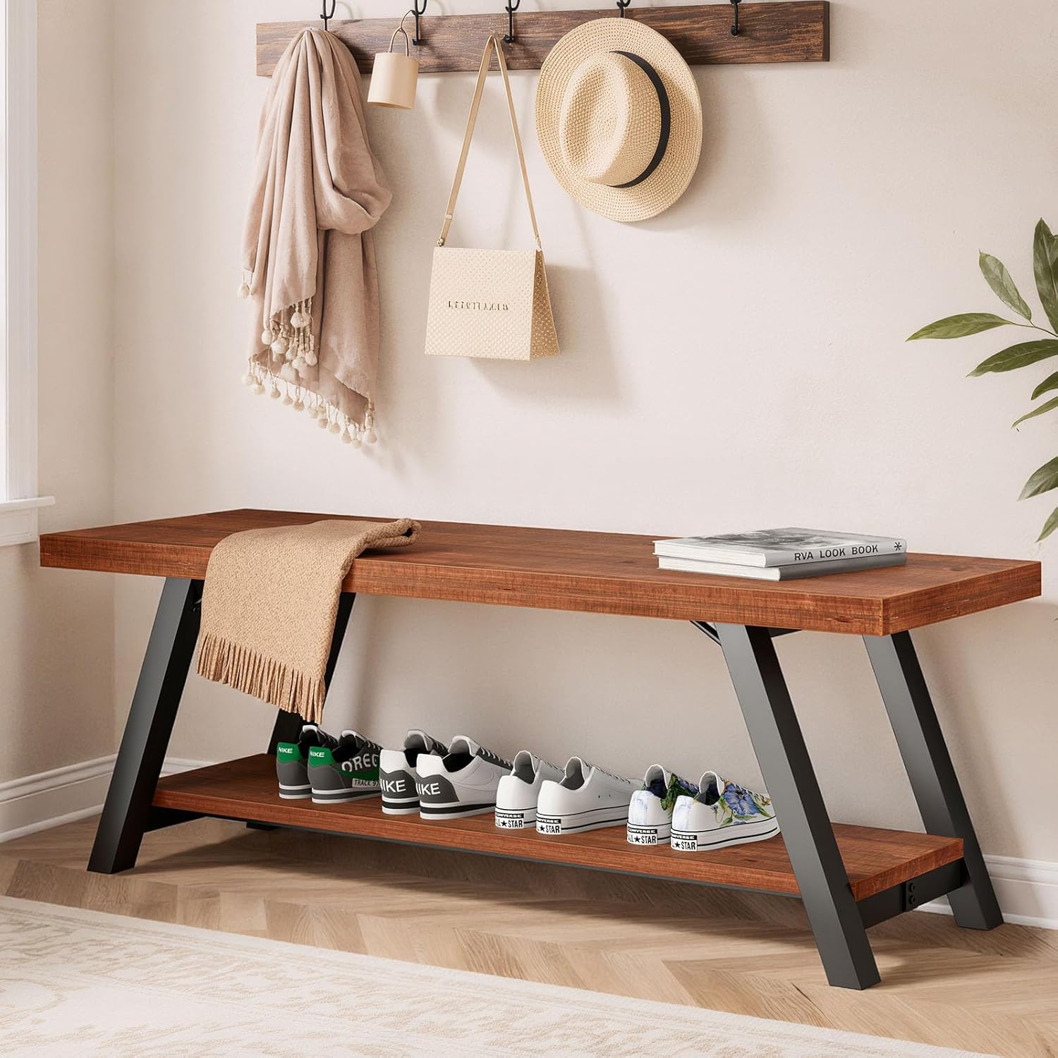 IBF Solid Wood Entryway Bench, Natural Real Wood Storage Bench, Farmhouse Wooden Shoe Bench in Entry Way Hallway Foyer Rack, Bedroom Bench Seat for Living Bed Mud Room Indoor, Rustic Brown, 47 Inch
