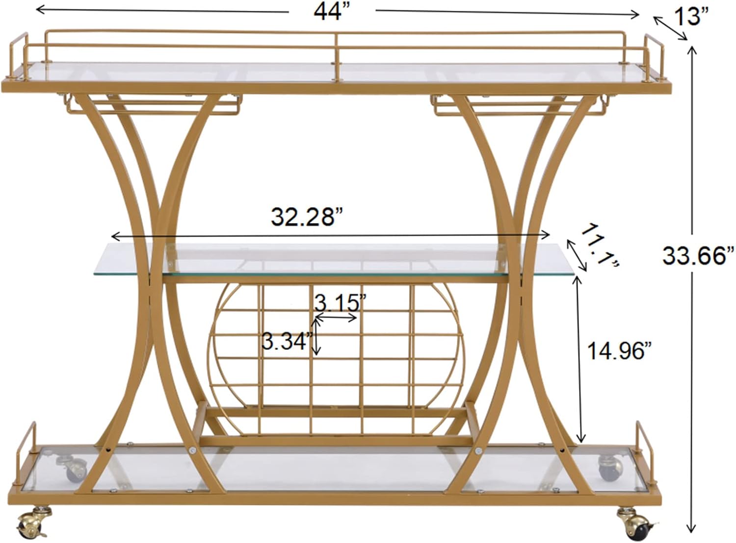 - Quality Serving Cart:Made of quality iron frame and MDF panels, this glass bar cart can hold a weight of 110 lbs total and 44 lbs for each shelf.It is designed to be easy maintenance and last for long time.