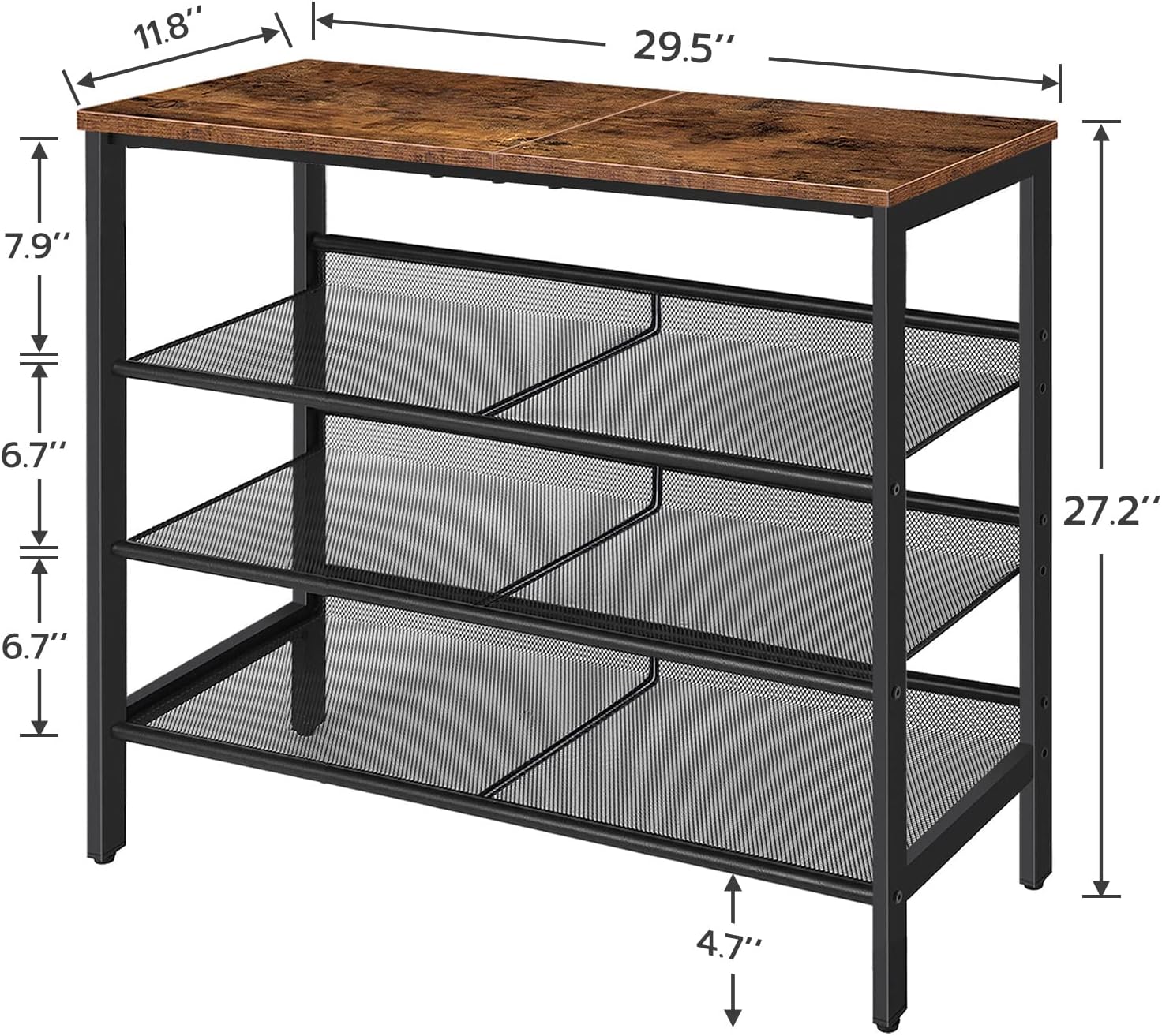 - Retro Industrial Style: The matte black frame harmonizes with the rustic brown finish, exuding elegance and showing a vintage industrial style that blends seamlessly into various home decors. This shoe organizer will be a focal point in your room