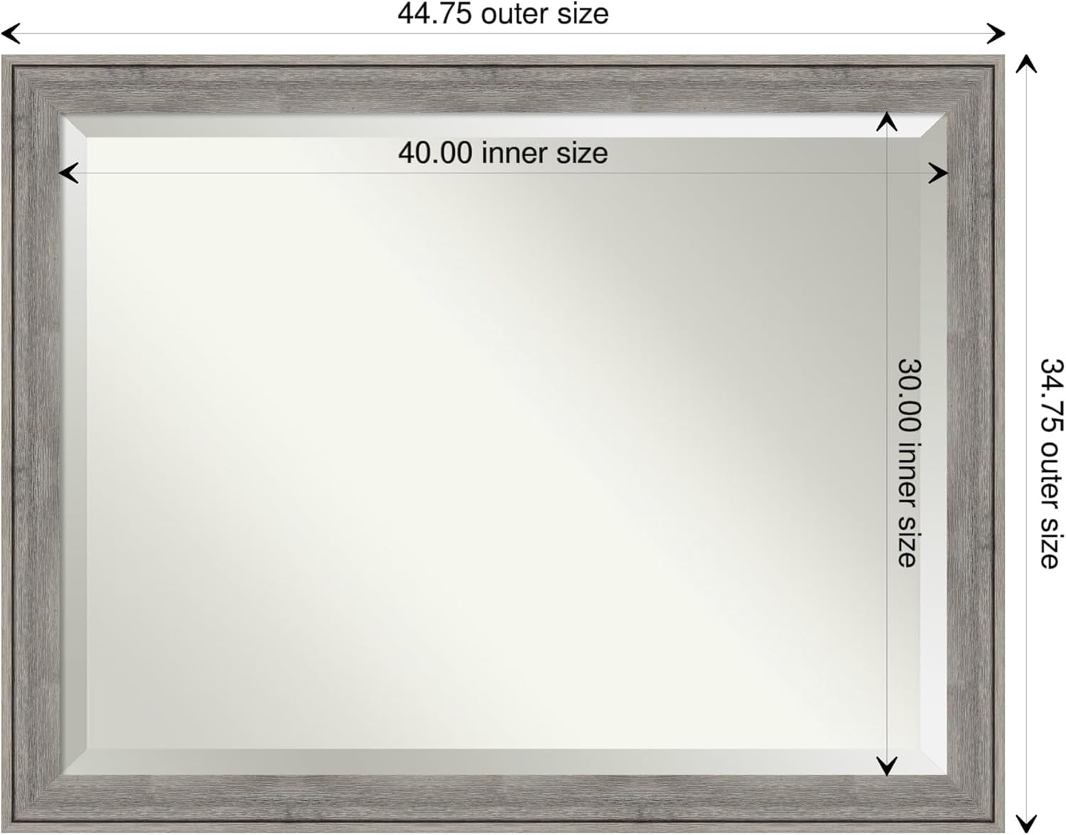- MIRROR DETAILS: This mirror features premium glass for a clear, undistorted image and is finished with a beveled edge to give the glass a decorative touch. The overall size of this wall mirror measures exactly 44.75 x 34.75 inches, including the frame. Its reflective area measures 40 x 30 inches.