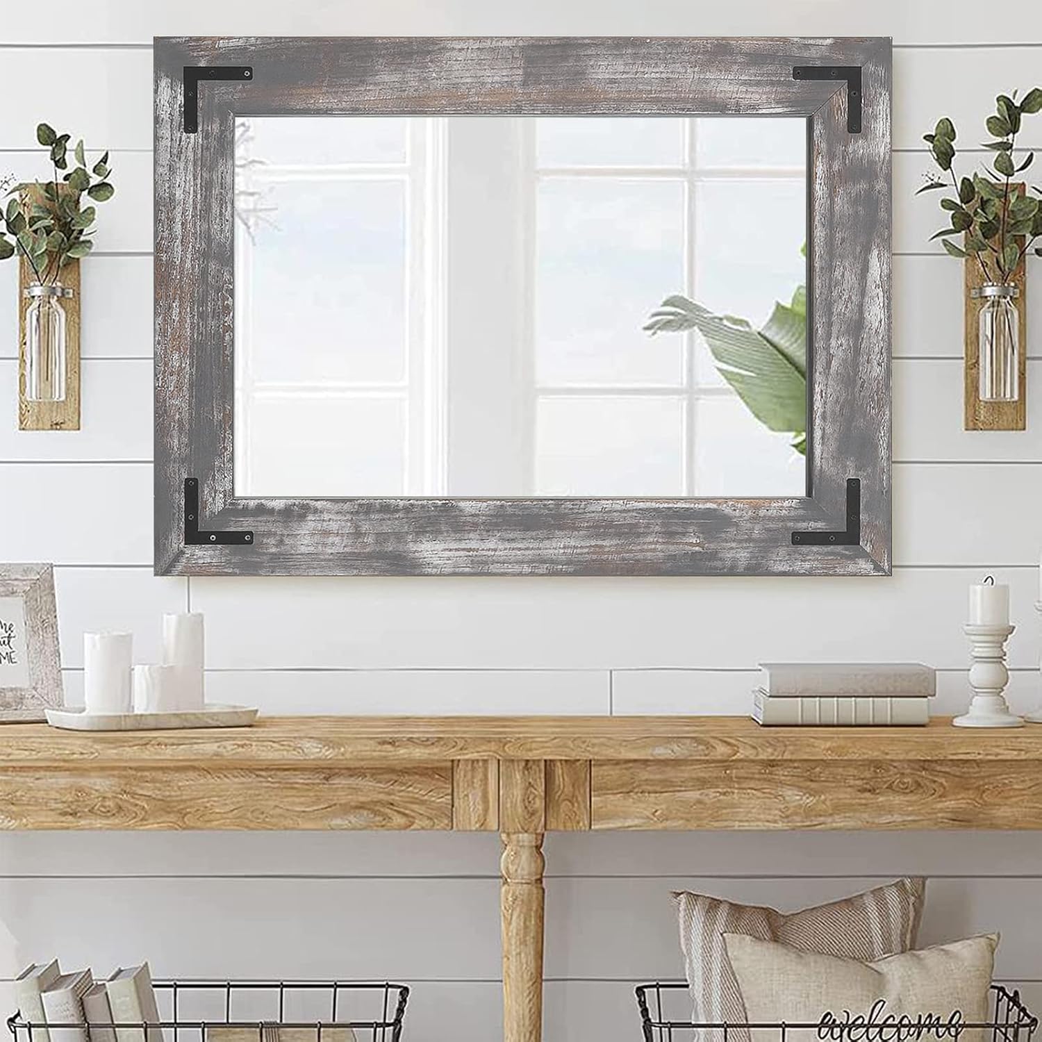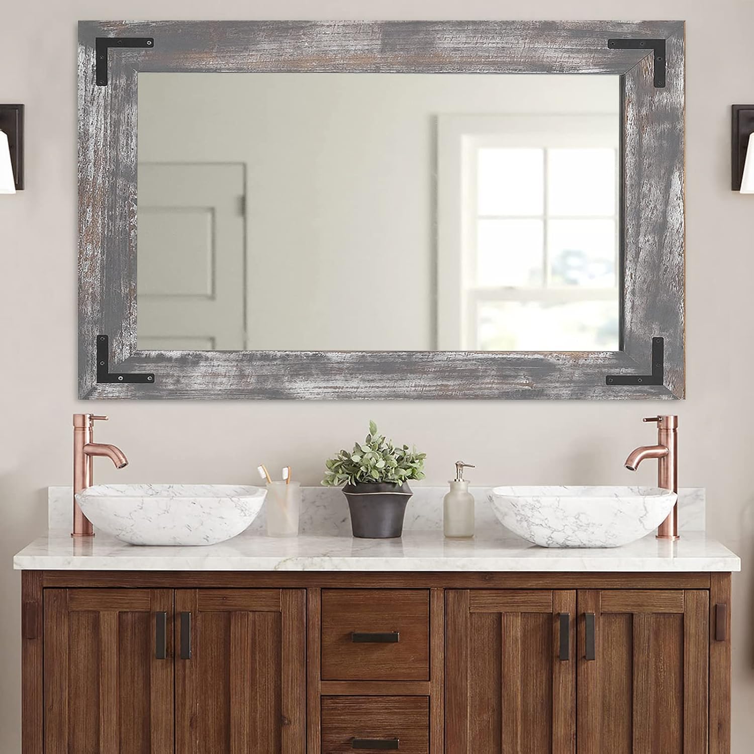 - RUSTIC WOOD VANITY MIRROR: Vanity mirror brings rustic character to any wall, while a black metal mount gives this design a modern farmhouse twist. Introduce a rustic touch to your farmhouse bathroom with this rustic wall mirror, a perfect pick for modern-farmhouse-inspired spaces.
