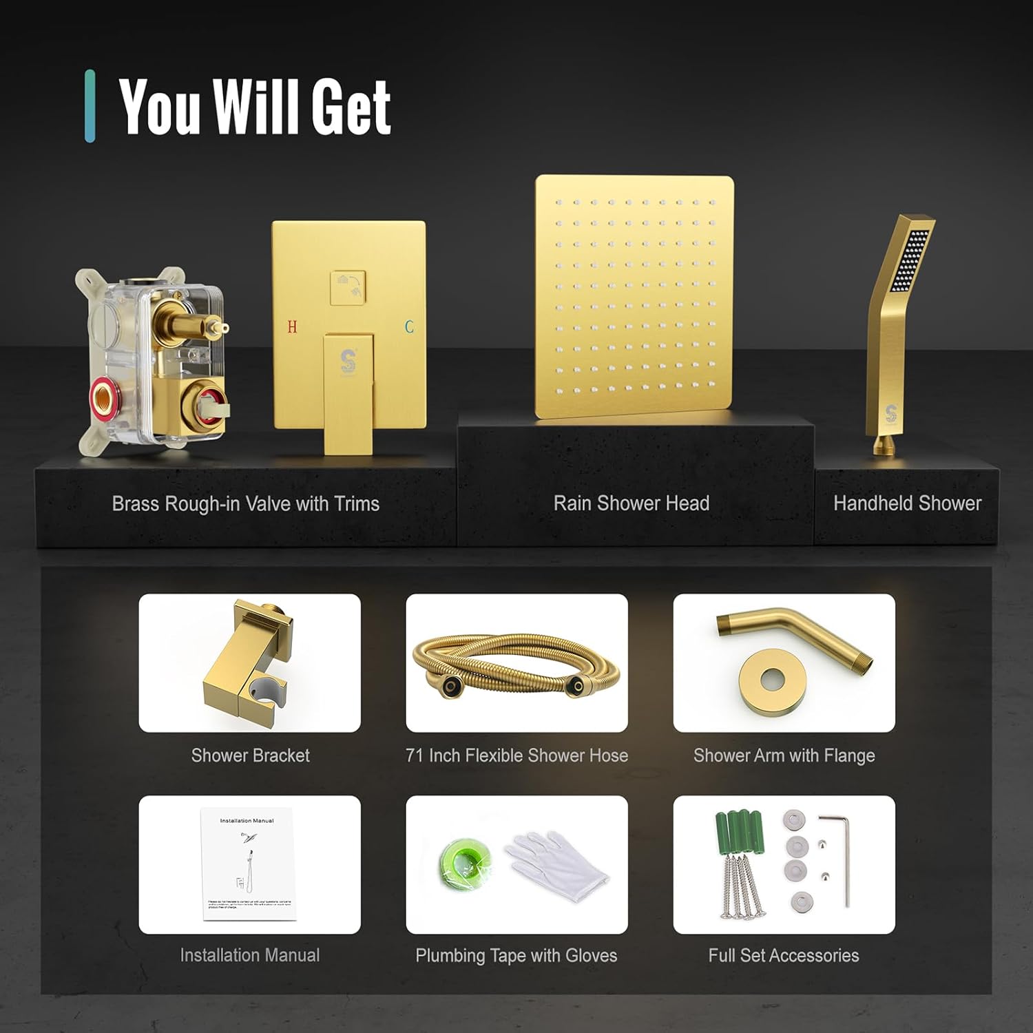 - Complete Shower System Included: This shower faucet set includes everything you need for a luxurious upgrade: a 8-inch rain shower head, a handheld shower head, a 71-inch shower hose, a 16-inch shower arm, a handheld bracket, a mixing valve, a panel, a handle, a mode knob, shower arm and bracket covers, and all necessary installation accessories.