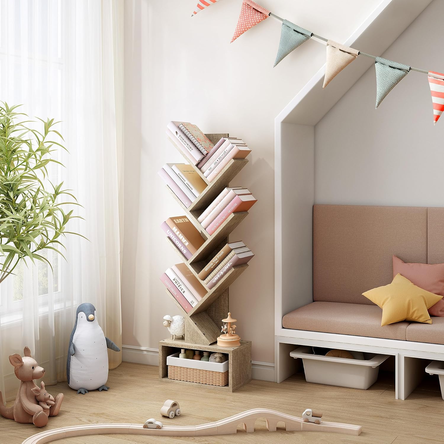 - [Sturdy and Durable Construction with Considerate Design] Built to last, our tree geometric bookshelf is made from premium grade board materials with a reinforced back panel for extra strength. Each shelf can support heavy items without sagging or wobbling. We also added an anti-tip design that is suitable for families with pets.