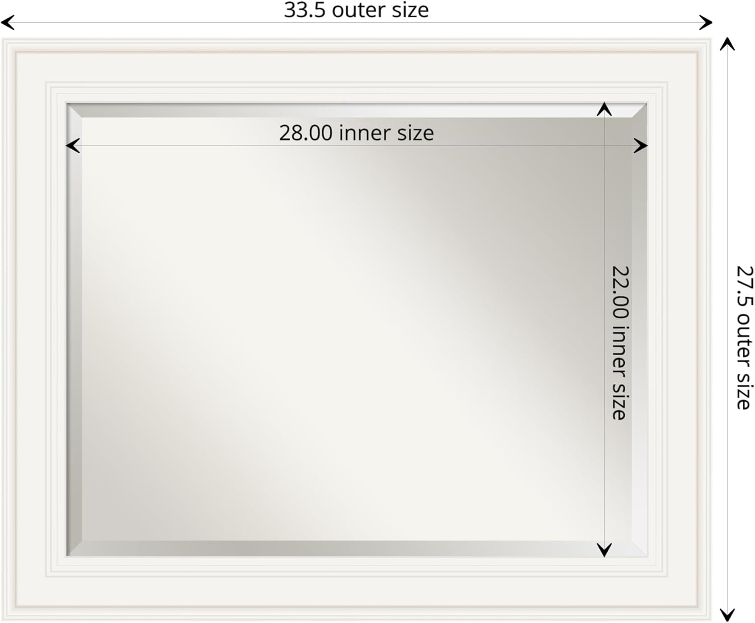 - MIRROR DETAILS: This mirror features premium glass for a clear, undistorted image and is finished with a beveled edge to give the glass a decorative touch. The overall size of this bathroom mirror measures 33.5 x 27.5 inches, including the frame. Its reflective area measures 28 x 22 inches.