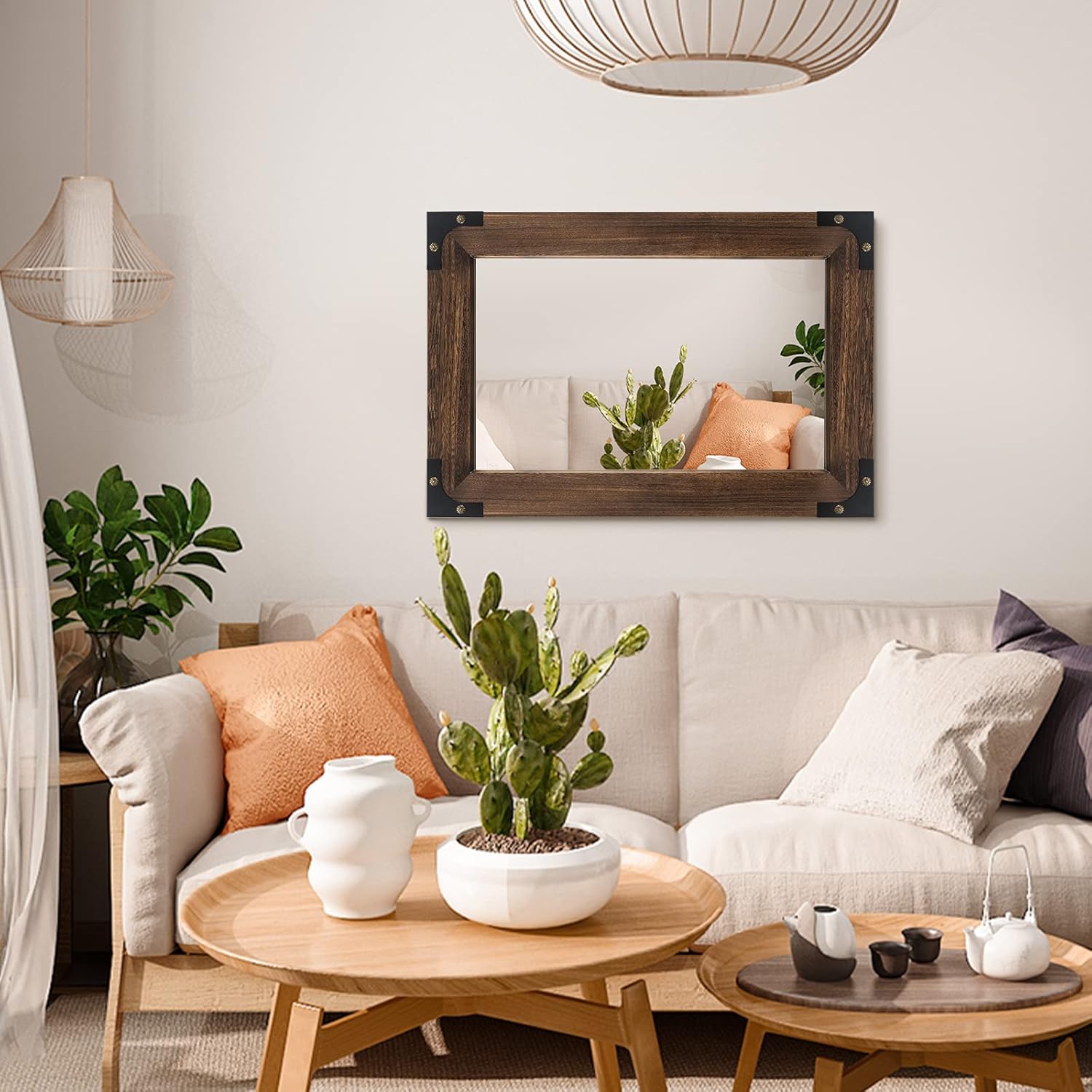 - [Rustic Mirror for Easy Installation] This wood framed wall mirror will definitely make your bathroom or other rooms the icing on the cake. At the same time, it is also very easy to install. There are already four attached D-shaped hangers on the back. You can use the rustic wooden mirror vertically in the bathroom or horizontally in the bedroom