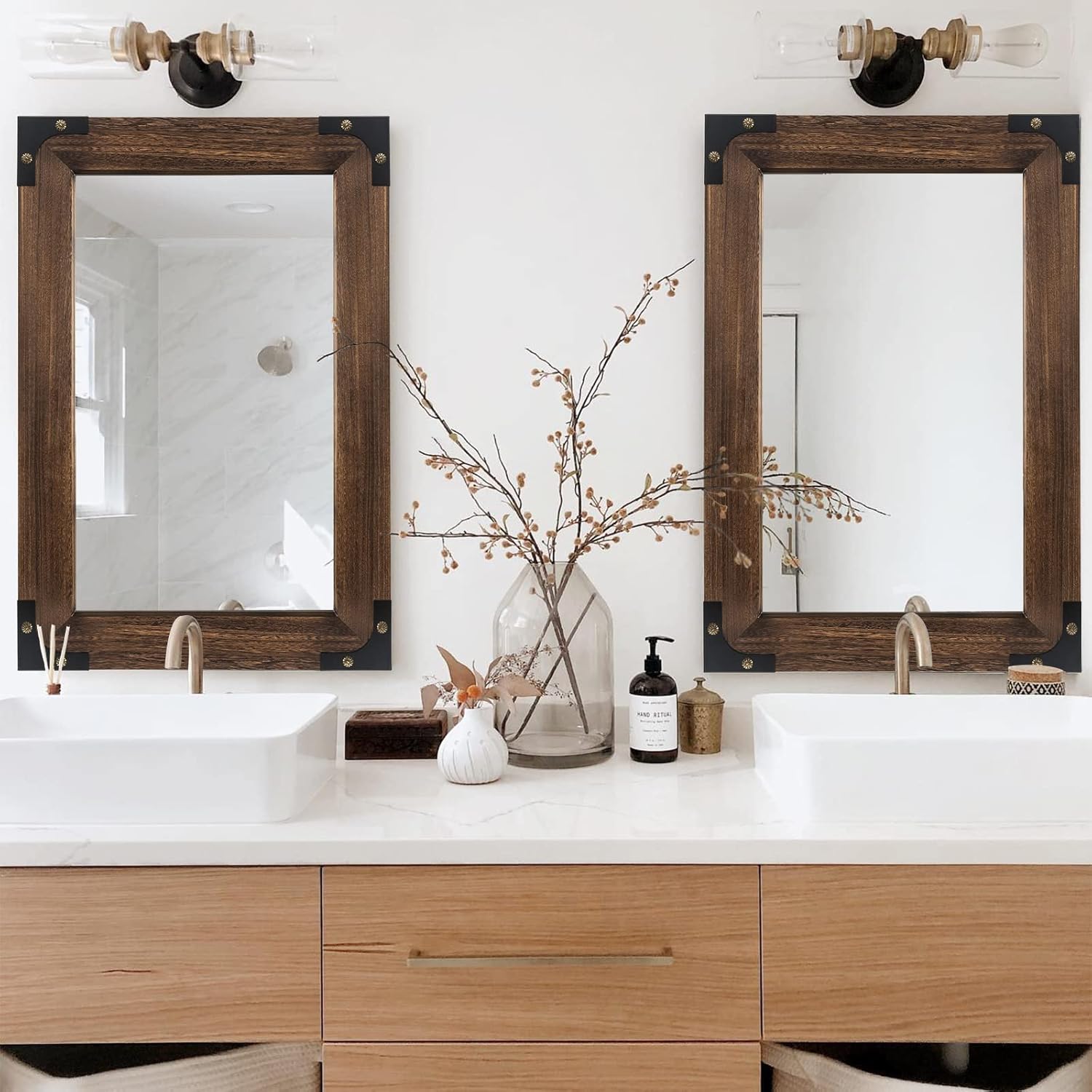 - [Farmhouse Mirror for Bathroom] If you are looking for farmhouse rustic bathroom mirrors, this is it! The perfect natural wood color and the small black metal details on the frame really add a delicate feeling to the wall, which can completely change the style of the room and make the wall decoration more beautiful. Please Note: Because the wood frame is made from a unique torched process, the wood veins pattern of each mirror frame is slightly different from the picture