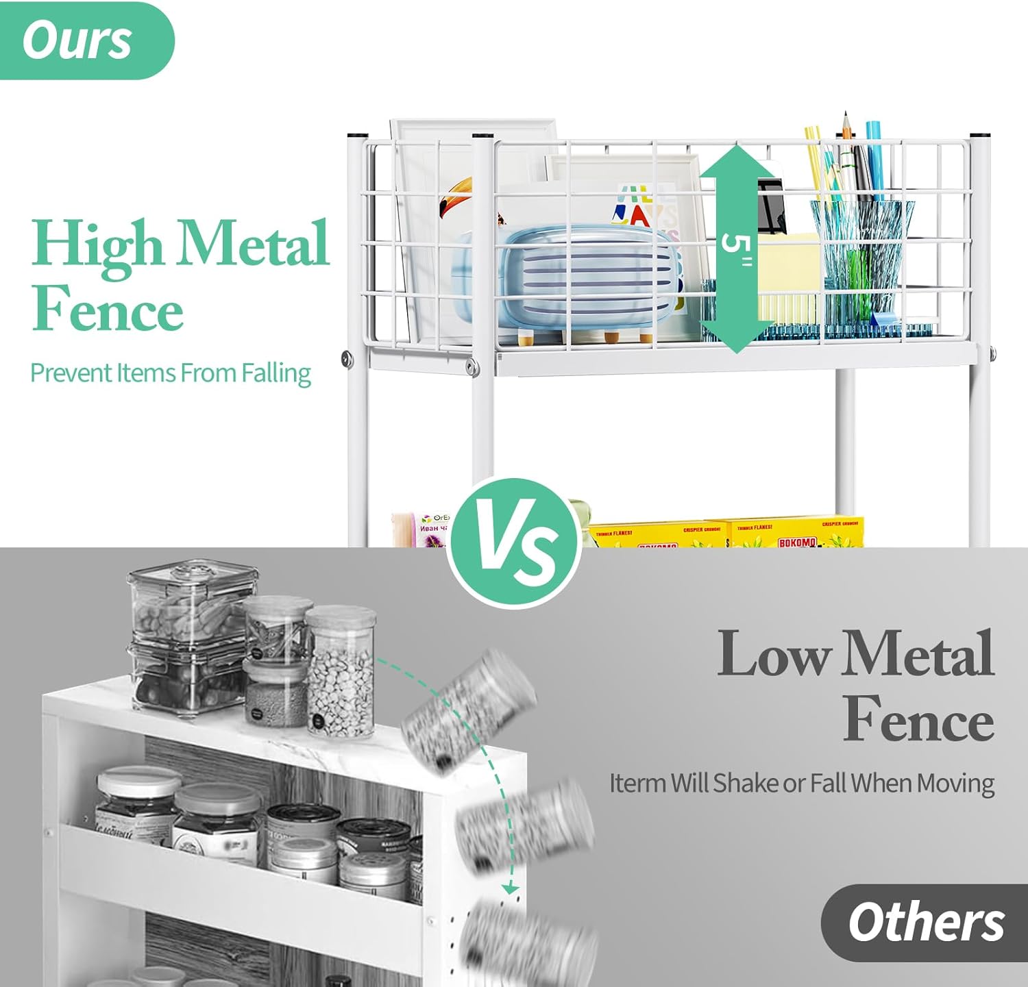 - HIGH MESH GUARDRAIL: Unique mesh top design give this rolling cart a fashion and elegant look. The top shelf not only offer wires to use hooks and place good -looking items, but also support you with paper clips to display your photographs on mesh top to satisfy the students' daily use at the dorms, and to add fun to daily life. You can discover more storage solutions and interesting ideas in the process of using this cart